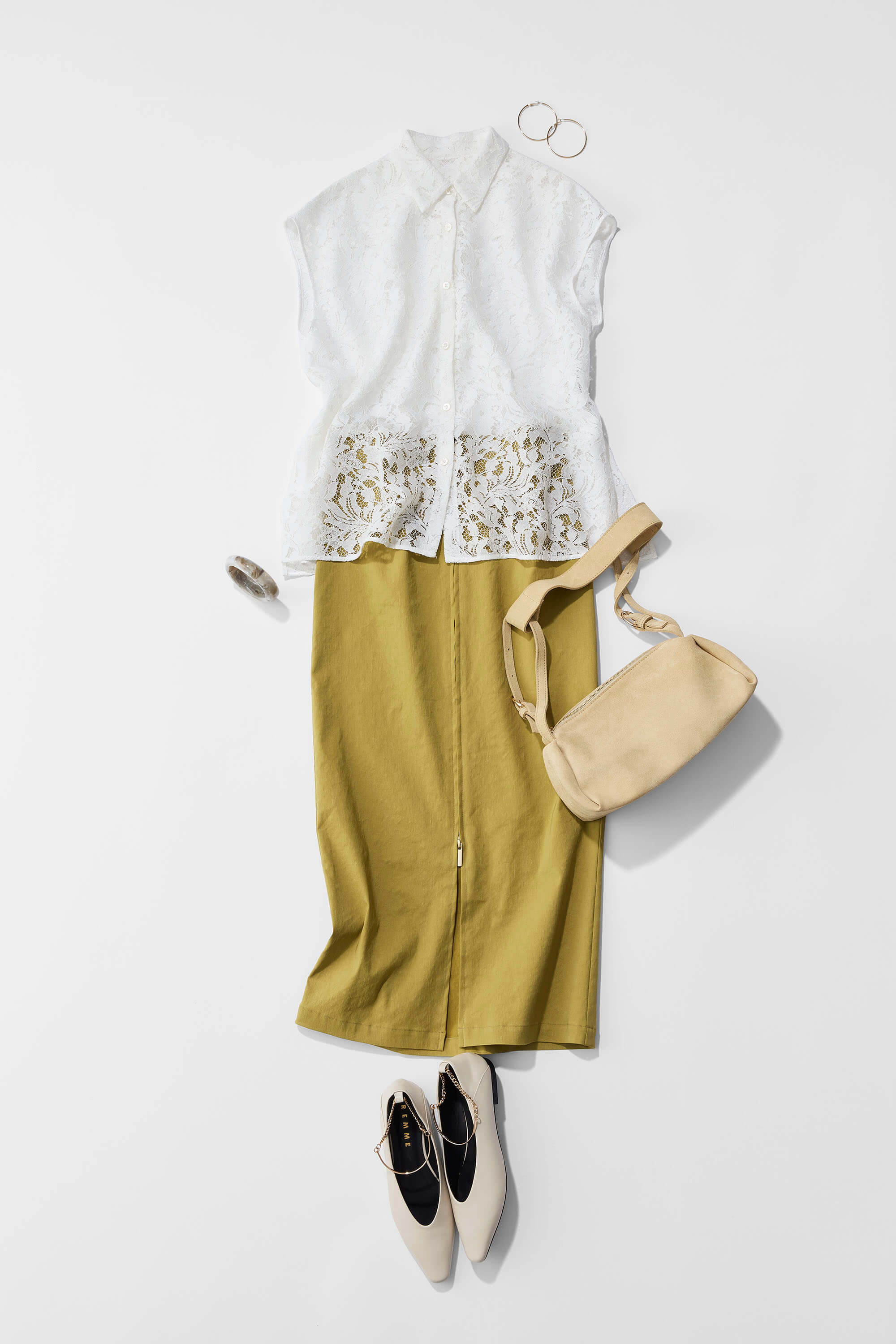 春らしいイエローグリーンのスカートを主役にしたスタイリング。パキッとしたホワイトと合わせると、より爽やかな印象に仕上がります。トップスには今季おすすめのレースブラウスを。ボタンを上まで留めてクラシックに着つつ、裾はあえてアウトして少しラフに崩すのがポイントです。透け感からのぞくカラーを楽しみながら、堅くなりすぎない軽やかな着こなしを楽しみたいコーディネートです。