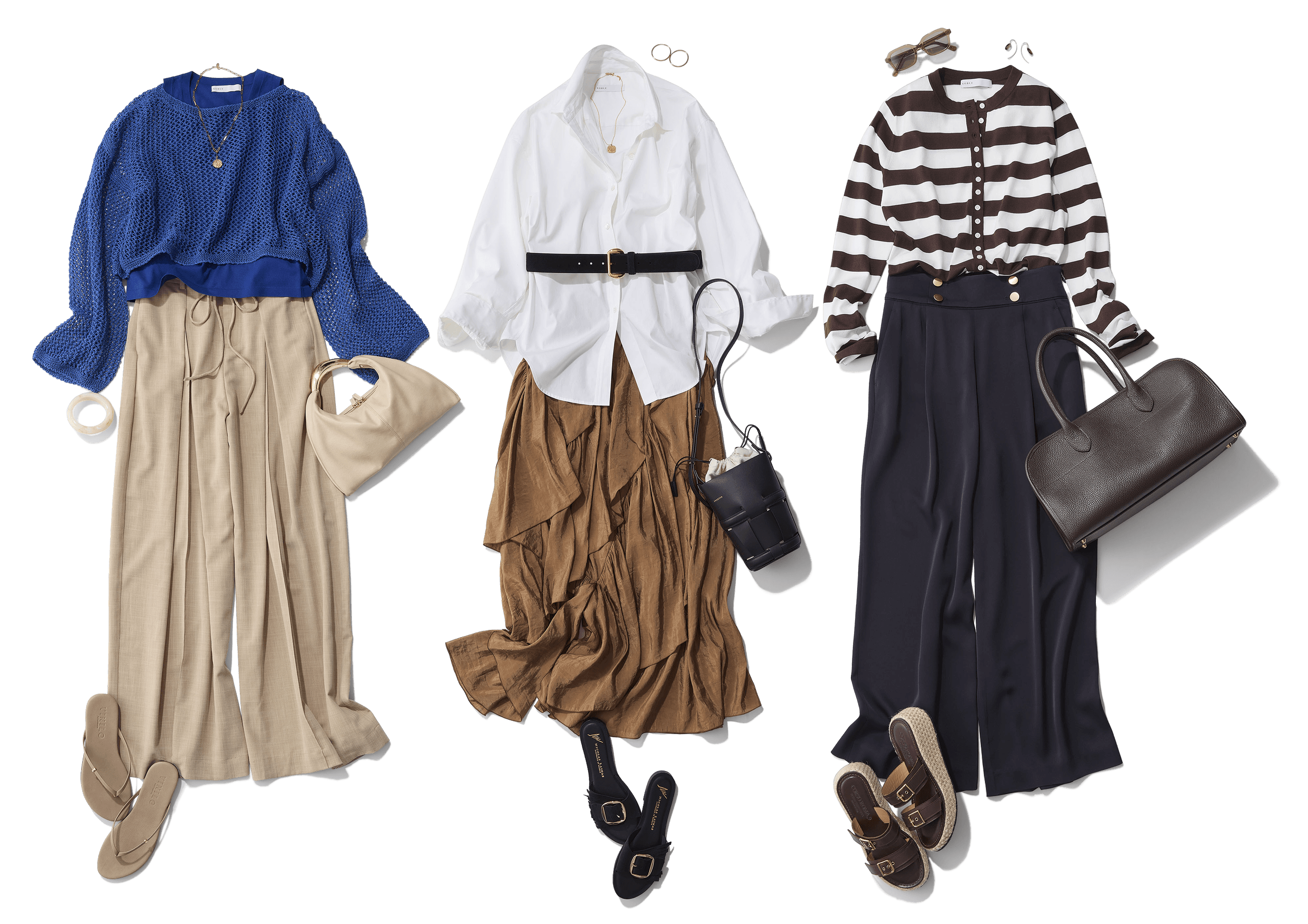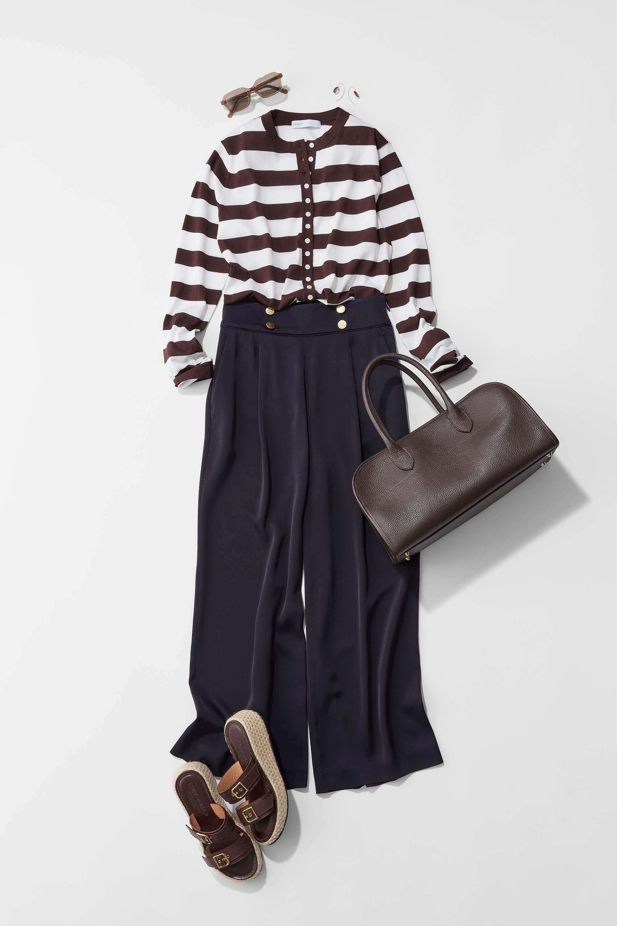 マリンパンツを主役に、トップスにはボーダーニットを合わせたマリンシックなスタイリング。高めのウエスト位置を活かすため、ニットはインして着こなし、すっきりと見せるのがポイントです。ボーダーは細ピッチではなく、あえて太めを選ぶ事で程よいカジュアル感をプラス。さらに、ブラウン×ホワイトの配色なので、ボーダーでも子どもっぽくならず、大人らしい落ち着いた印象に仕上がります。