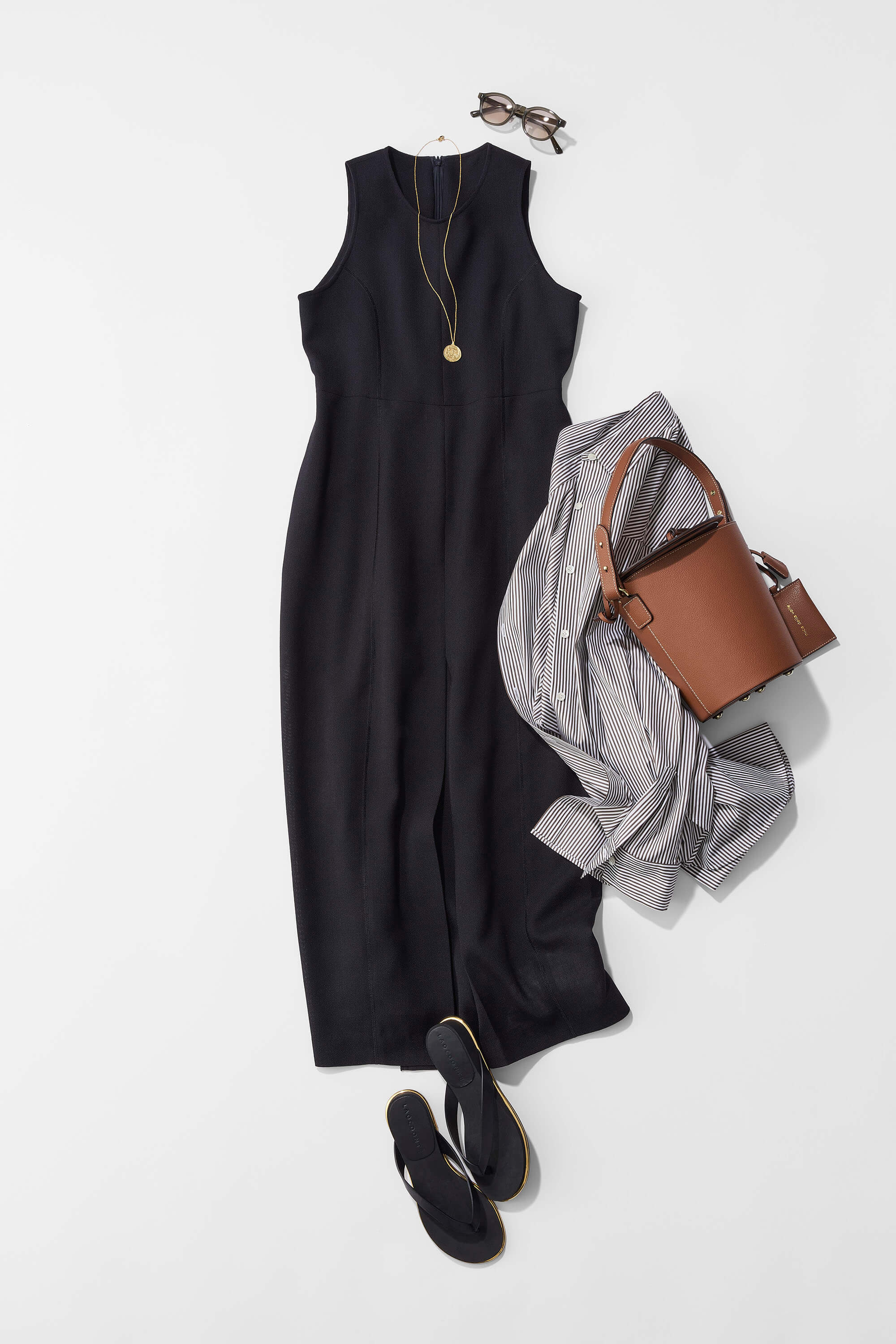 胸元が深めに開いた黒のワンピースは、きれいめにもカジュアルにも着回せる一着。シンプルな着こなしはもちろん、オーバーサイズのシャツを羽織ったり、ウエスト巻きにしてラフな休日スタイルにアレンジするのもおすすめです。しっかりとした丈感がある事で、コンサバになりすぎず、大人のリラックス感を演出。ゴールドのアクセサリーやシューズを合わせれば、上品なアーバンスタイルにも最適です。