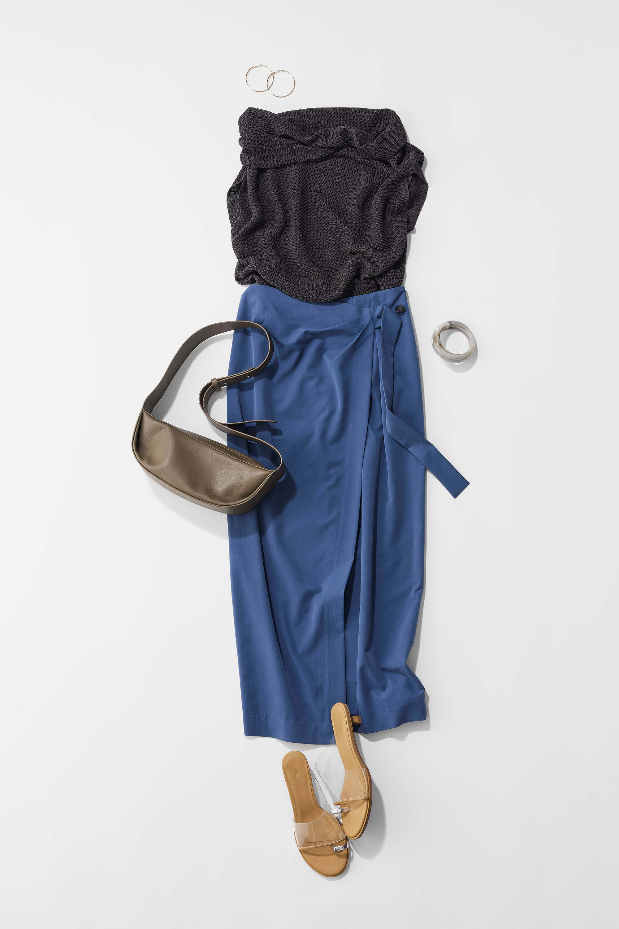鮮やかなブルーのスカートに、パキッとさせすぎないグレーのトップスを合わせたスタイリング。カラーに挑戦しつつも自然になじむ配色で、全体のバランスを整えています。スカートはタイトで長め丈なので、トップスはオフショルで少し肌見せを。かっちりしすぎず、程よくリラックス感のある大人のコーディネートに仕上げています。