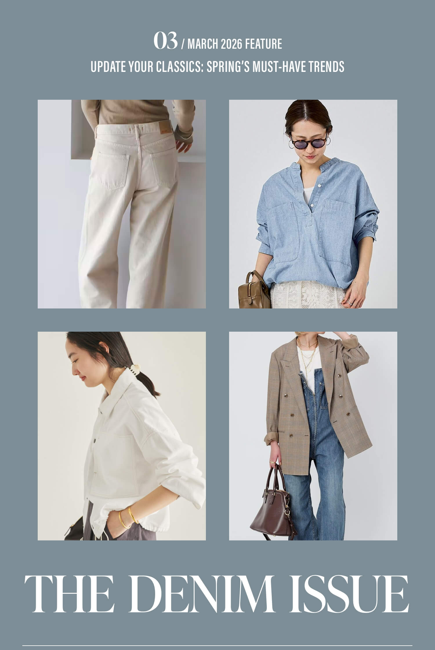 ニュアンスカラーデニムホワイトやベージュ、グレーなど、柔らかな色味で新鮮に。いつものコーデに取り入れるだけで、季節感がぐっとアップ。