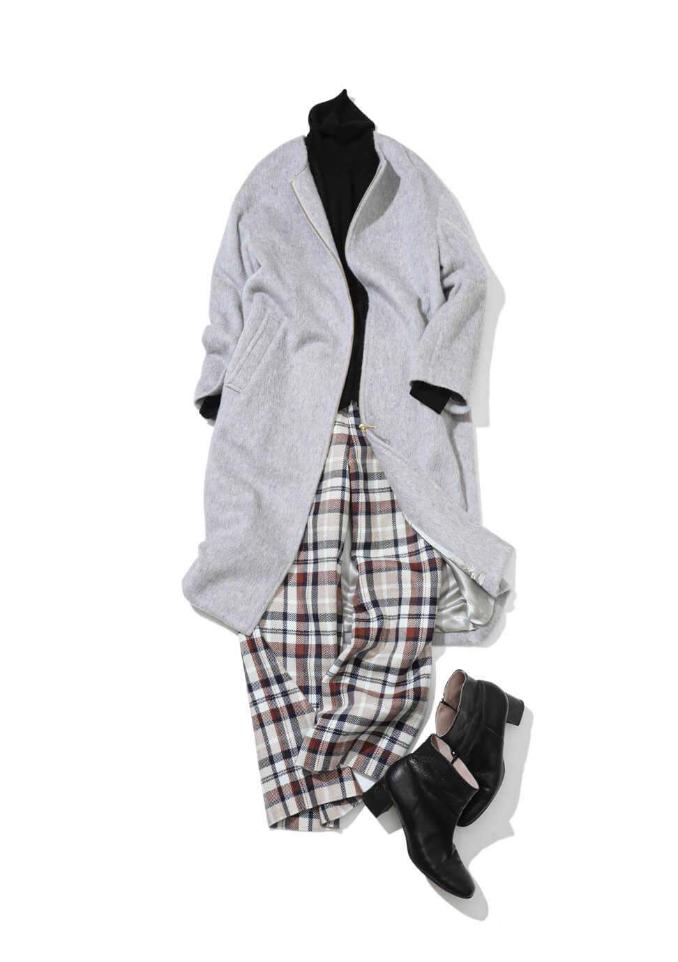 今年も押さえておきたいチェックパンツは、合わせるアイテムに気を配らないとトラッド一辺倒に陥りがち。今日はレイヤードは控えめにおさえて、上質な大人コートの力を借りて引き締め。温かみのあるブラウンチェックとアイシーなグレーとのミックスで、新しい一面を引き出して。