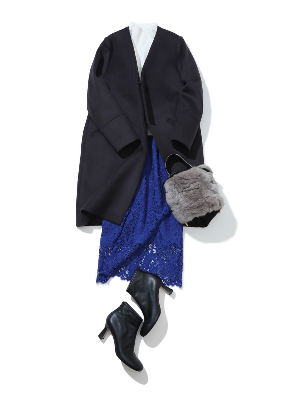 取引先へのアポイントがたくさん入った日は、ミニマルなノーカラーコートを羽織ったスカートコーデでクラシカルにまとめれば印象アップ。仕事が終わった後は彼とレストランの約束。仕事にもデートにも一目置かれる、ロイヤルブルーが艶めくレーススカートをインしていれば、オケージョン対応もバッチリ。ファーバッグを抱えて愛されスタイルを完成させて。