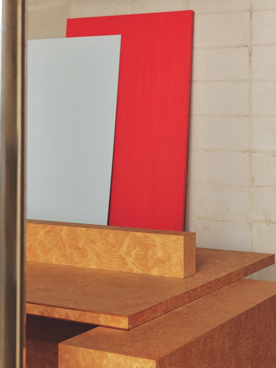 コンクリートのように静かで落ち着いたグレーカラーと、統一感あるフットベッドが足元に洗練を添える。