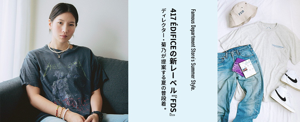 今年で10周年を迎える417 ÉDIFICEから誕生した注目の新レーベル「Famous Department Store」。そのクリエイティブディレクターにメンズブランド「PURPLE THINGS(パープルシングス)」のデザイナーを務める菊乃を抜擢。スタイリッシュだけじゃない、サスティナブルなレーベルを目指す彼女の想いをインタビュー。そして、最新コレクションの中から菊乃自身によるスタイルサンプルも特別に公開します。