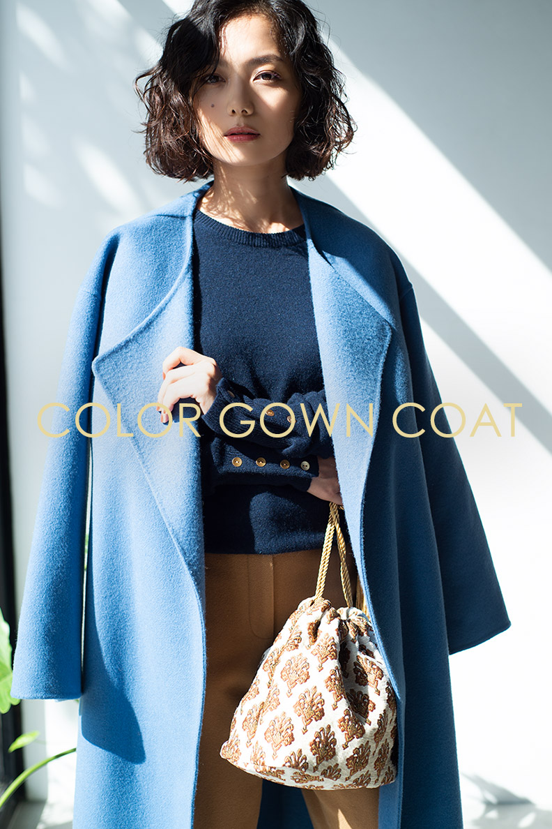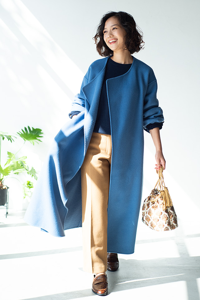 まず今季おさえておきたいのが、「カラーコート」。主役級な存在感がありつつも、ほんのりパウダリーな発色のブルーなら、ネイビーやベージュなど、ベーシックカラーとの相性も良い。加えてデザインはややリラックス感のあるノーカラー、というバランスがポイント。共布ベルトをキュッと結んでウエストマークすればきれいめに、デニムコーデにバサッと羽織ればカジュアルにと、万能なカラーコートは必見。