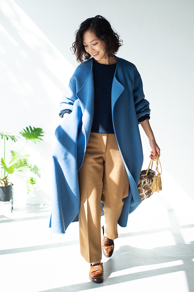 カシミアのネイビーニット×キャメルパンツという、冬のワンツーコーデをブルーコートでぐっと今どきにアップデート。ベーシックカラーが多い人にこそ、カラーアウターがあると重宝。大きめに設定されたラペルも顔まわりを上品に盛り上げてくれる。