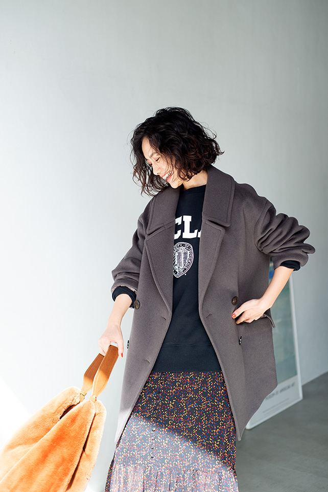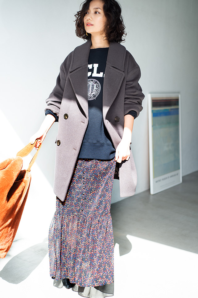 コートにきちんと感がある分、インナーはダークカラーで統一したロゴスエットや花柄のシフォンスカートと、あえてカジュアル方向に振っても大人っぽさをキープできる。小物は、今季復活のブーツやエコファーバッグで季節感を存分に楽しんで。
