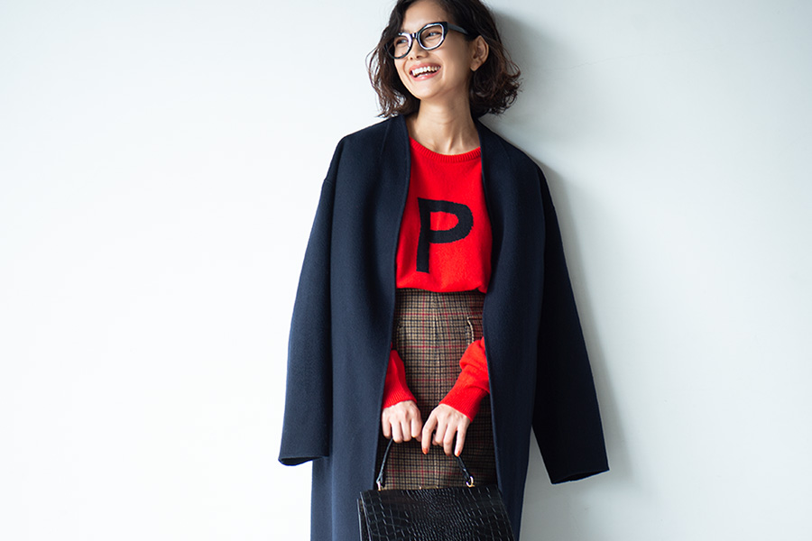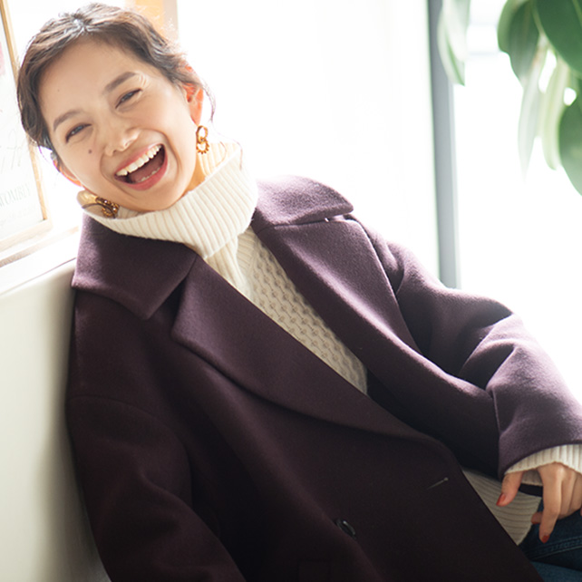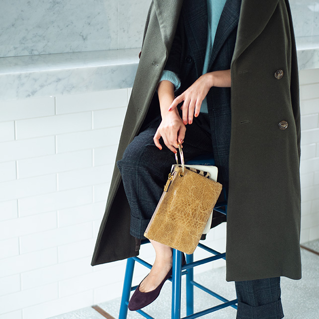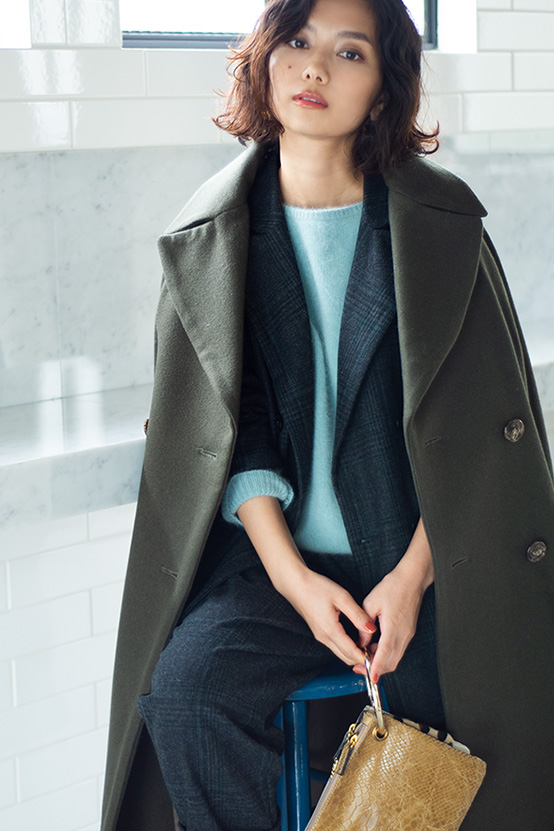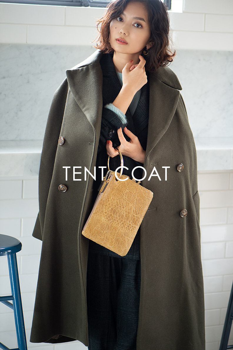 ベーシックでありながら、程よいモード具合にファンの多い“TICCA”。肉厚なメルトンで作った、テントシルエットのダブルボタンコートは、大胆かつエレガントなムードが漂う。こっくりとした濃いカーキで、ベーシックカラーはもちろん、きれい色とも合うから、オンもオフも活躍してくれる。長く愛せる一枚。