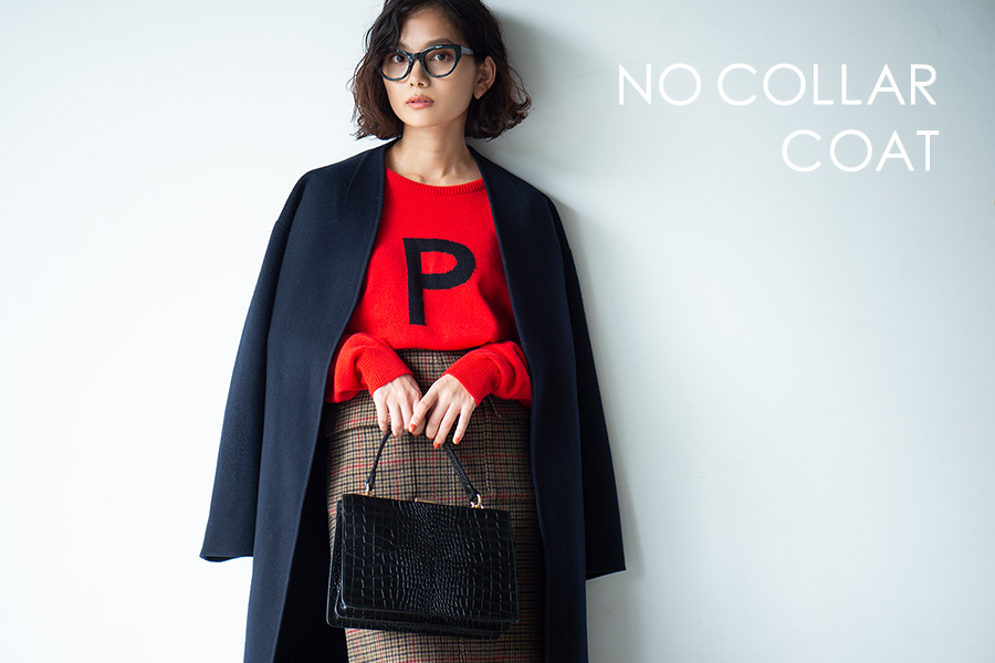 ダブルフェイスのV開きノーカラーコートは、フェミニンにもマニッシュにも着こなせて、一枚あると便利。滑らかで上品なツヤを感じるウールを使用しているからこそ、究極に削ぎ落としたデザインがいきる。ノーボタンゆえ、カーディガン感覚のようにさらっと。探すとなかなか見つからない、赤みをおさえた深いネイビーの色味も絶品。