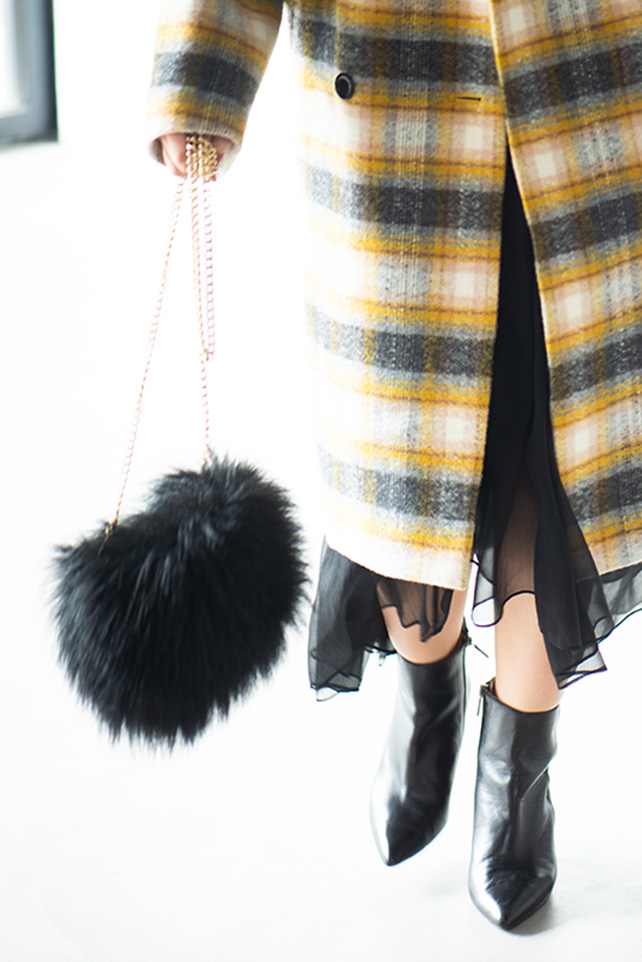インナーは、チェックの中にある色をひとつ拾ってワントーンで仕上げれば、難なくコーディネートが完成。たとえば、ワンピースやバッグ、ブーツを黒で揃えてオーブブラックに。毛足の長いコートと透け感のあるワンピースの素材ミックスも遊び心豊か。