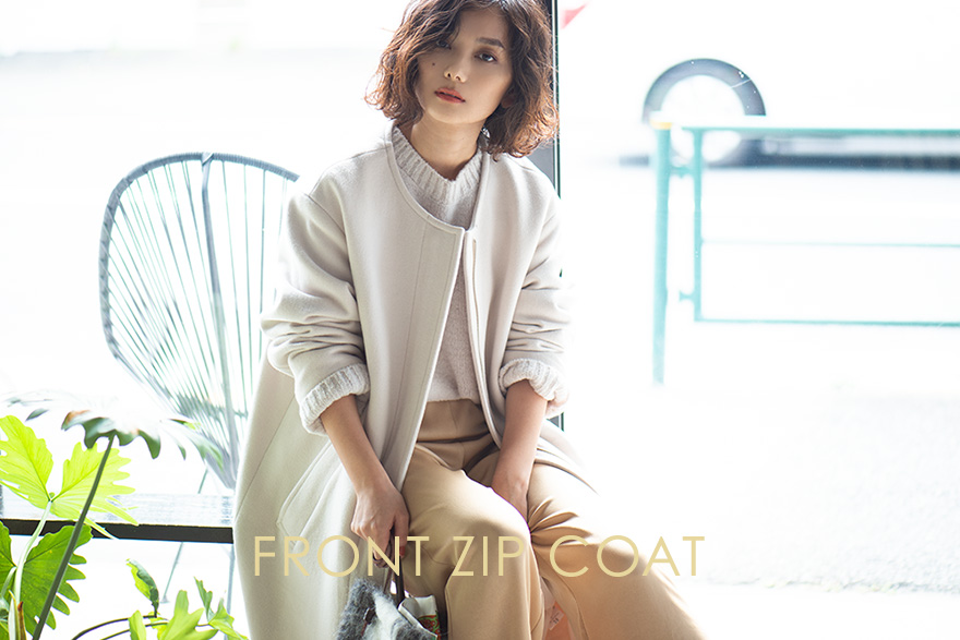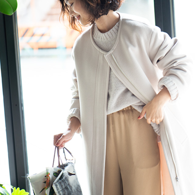 素材の色を生かした、ややピンクよりのアイボリーとすっきりとしたノーカラーデザインがベストマッチ。冬の白やベージュと好相性な淡色コートは、フェミニン派のワードローブにすんなり馴染むはず。滑りがよく着脱しやすい裏地付き、しっかり防寒できるファスナー開閉仕様のフロントで、機能面もしっかり頼れる。