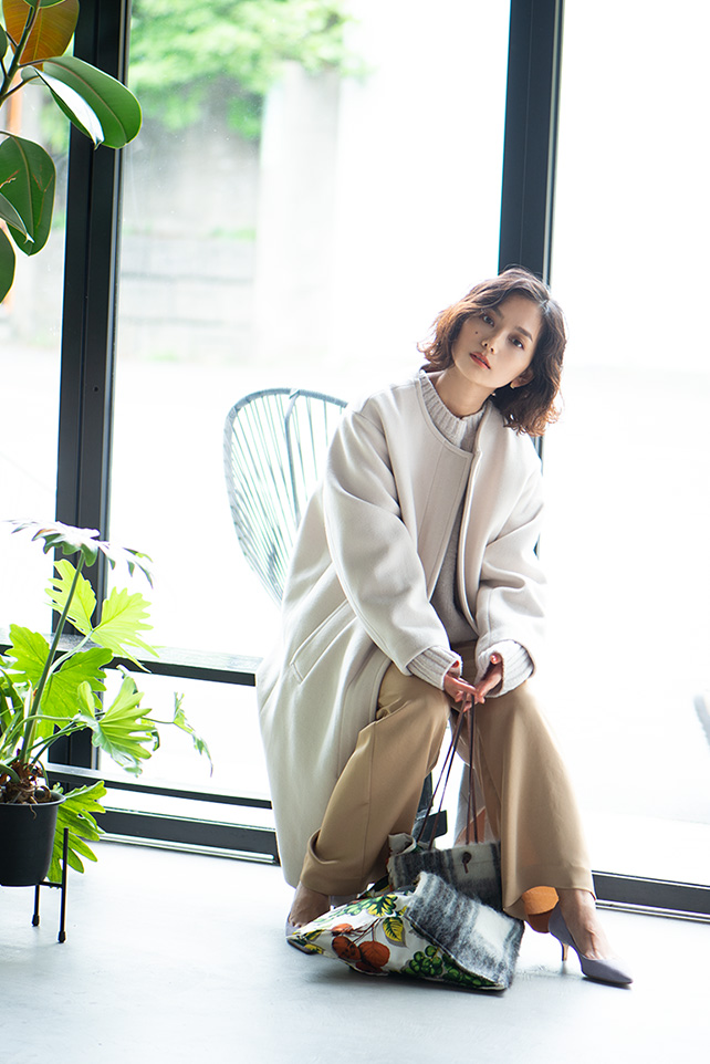 コートの優しいアイボリーカラーを存分に味わうには、クルーネックのベージュニットにキャメルのワイドパンツで、ほっとするミルキーなグラデーションに。肩の力の抜けたコーディネートに、ポインテッドのヒールパンプスやキャッチーな柄バッグを添えて。