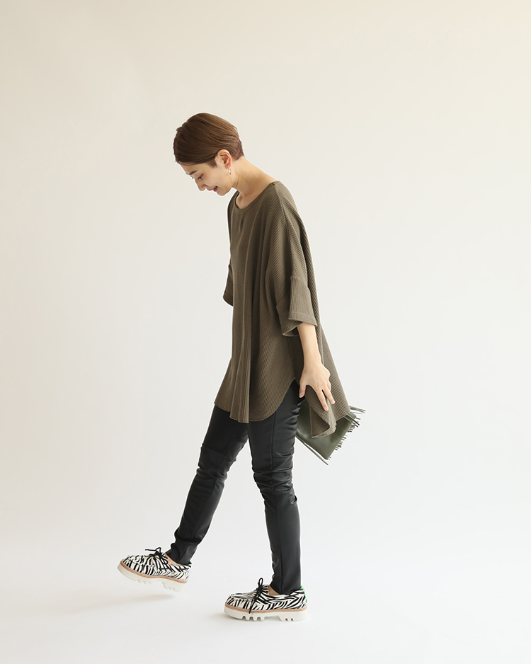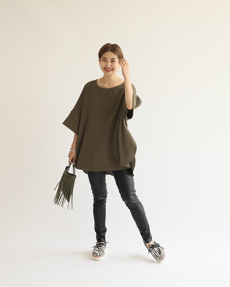- ワッフル素材のゆったりトップスには、ボリューム感がある分、