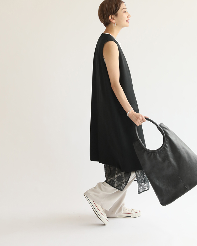 ECOレザーで素材変化を出して、大人のレイヤードスタイルを楽しんで。