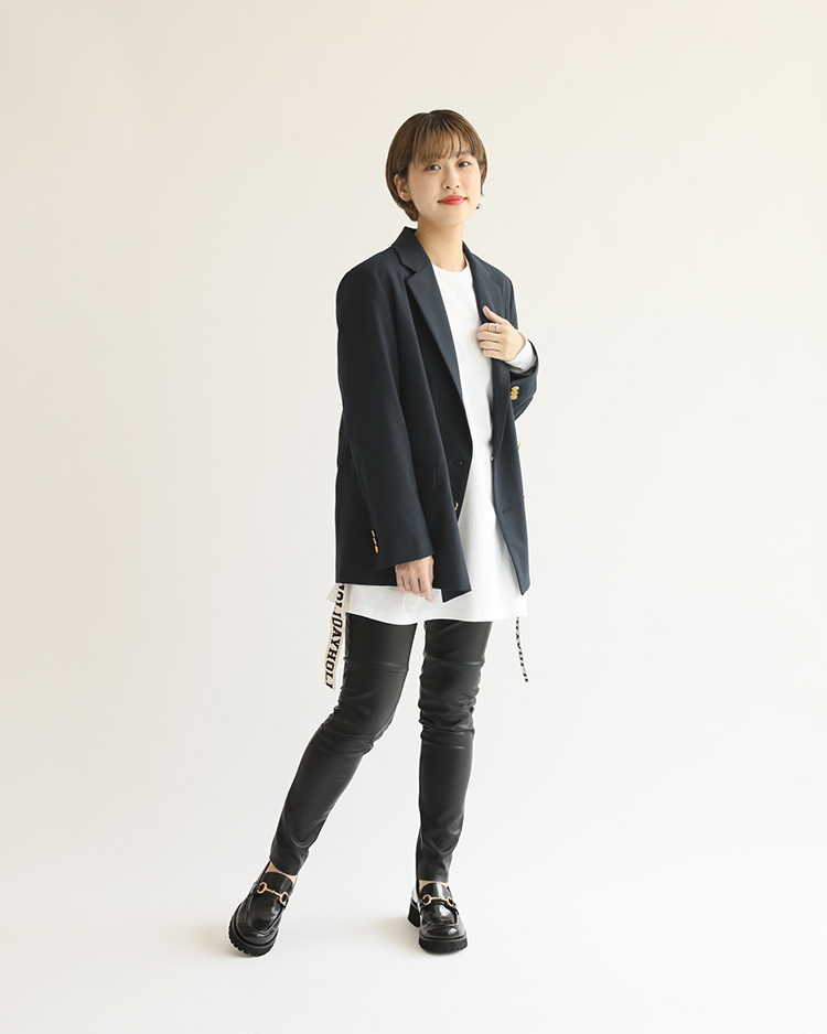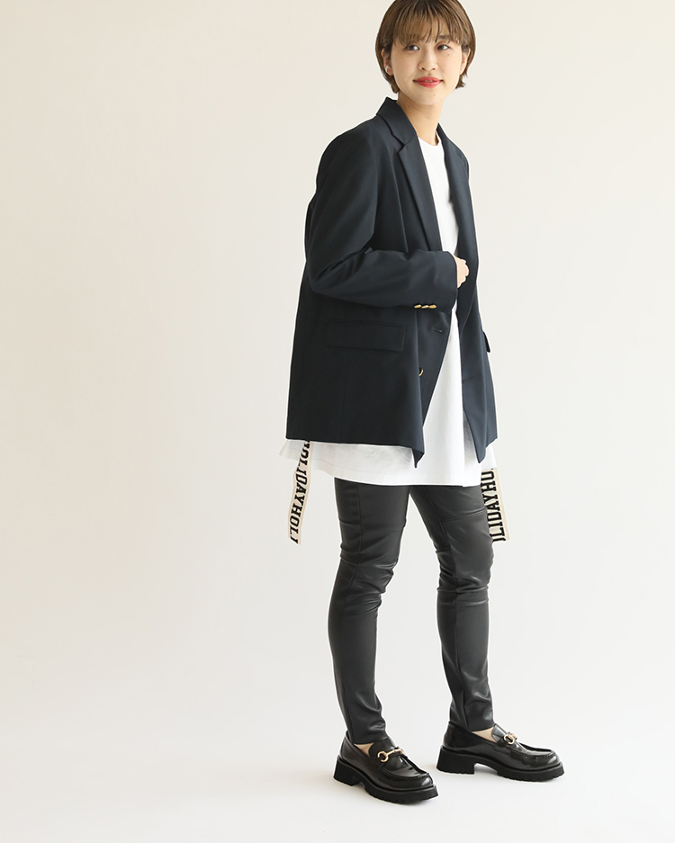 ボトムスはタイトなレザーでバランス感をしっかりと意識。