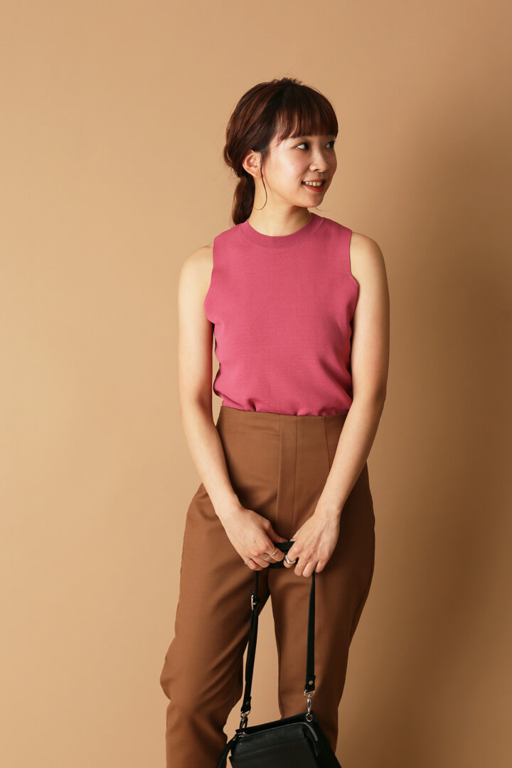 - 暑い今から着られる、シャリ感のある糸で仕立てたノースリーブニット。
