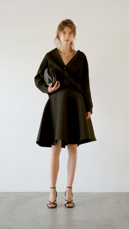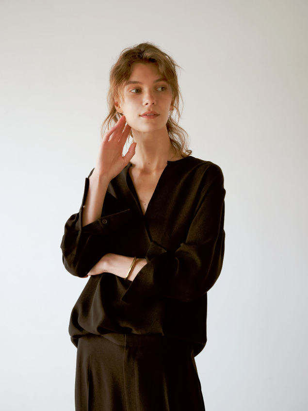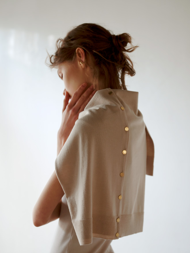 ジャケットの中にも着られるコンパクトなサイズ感やデコルテとネックレスが映えるボタン位置。