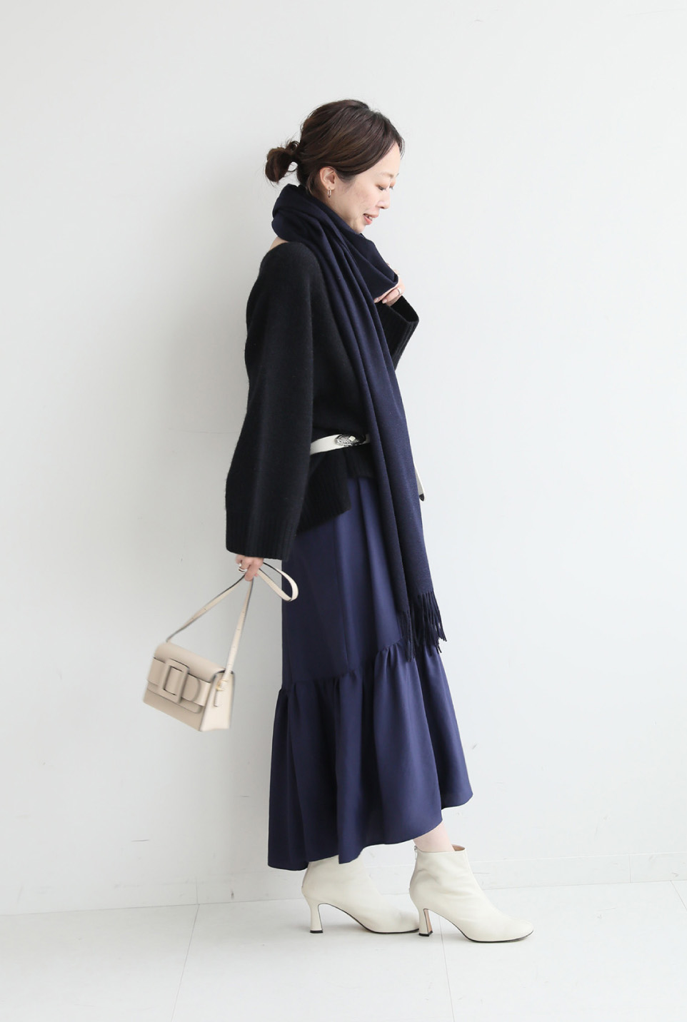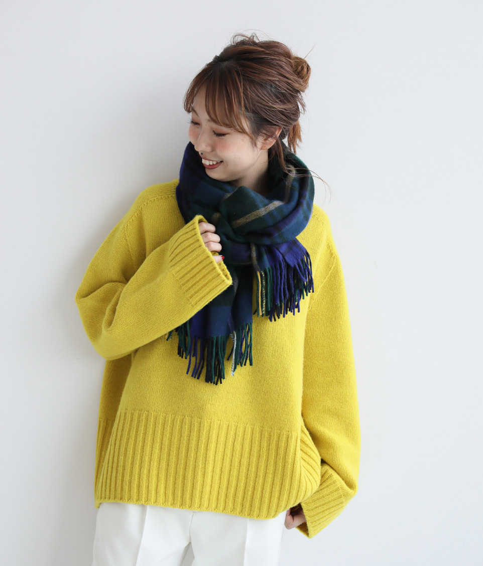 - ラフに羽織るだけでクラス感を格上げさせるカシミヤの大判ストールは、大人女性のマストアイテム。今の時期は、ニットの上から巻いて首元にボリュームをオン。