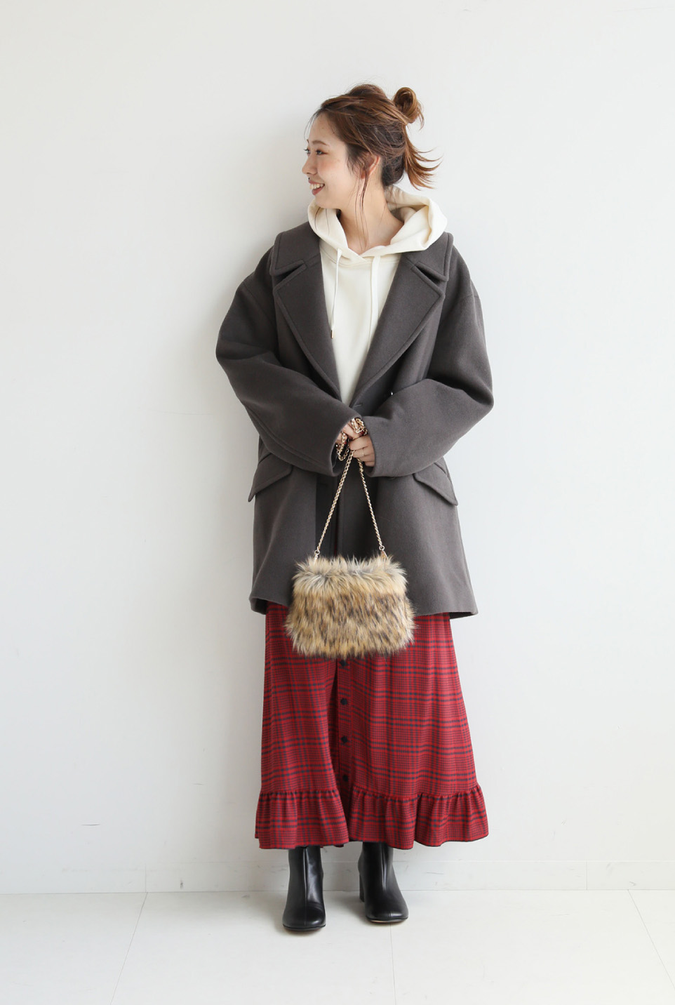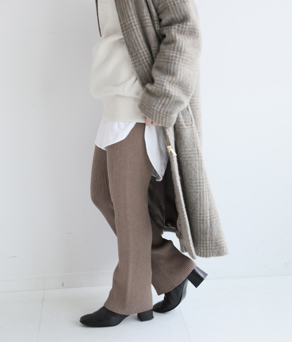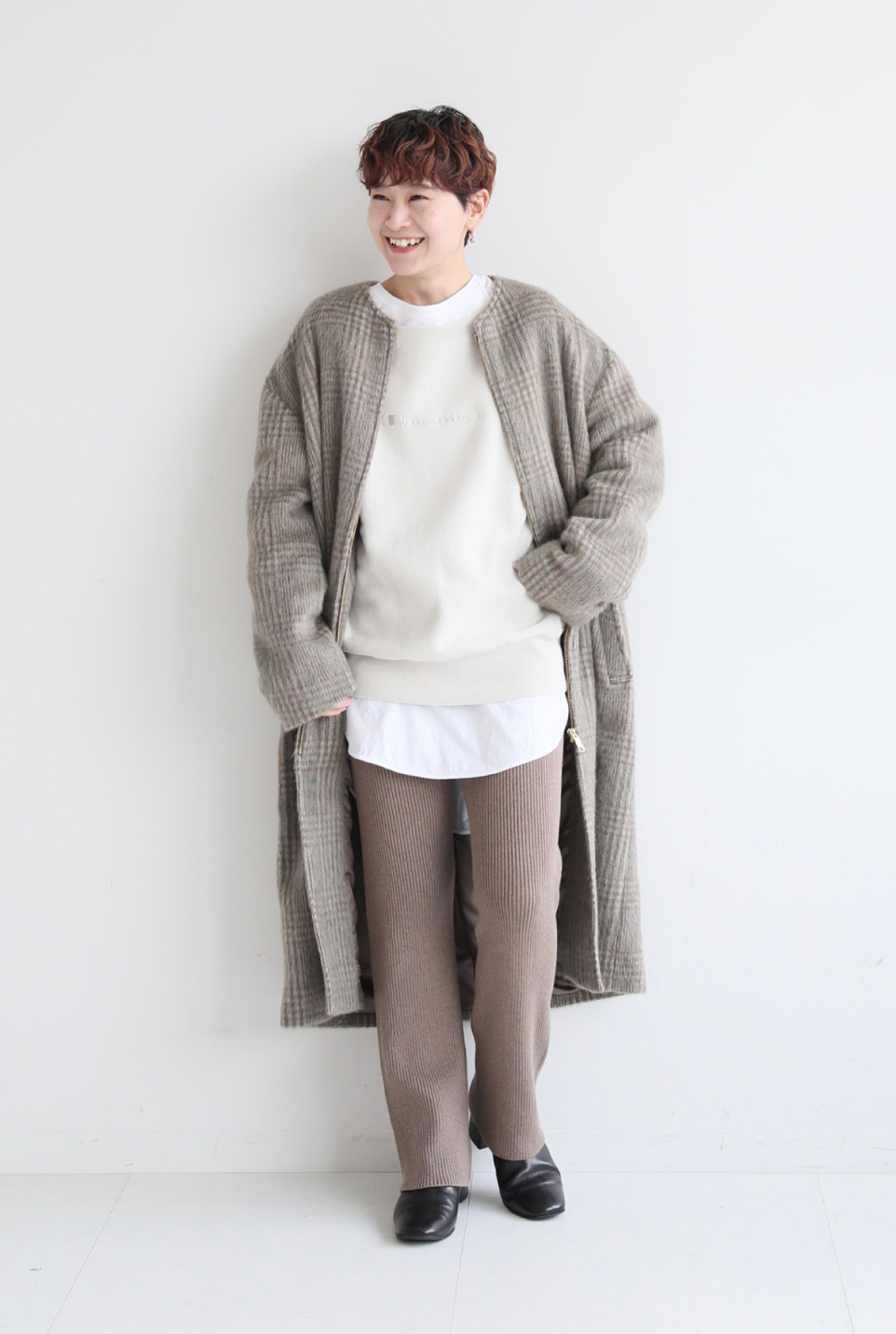- 主張のでるチェック柄は少し気恥ずかしい・・・そんな時にオススメなのが、ソフトなシャギーチェックが落ち着いた雰囲気のクルーネックコート。ホワイト~グレージュの大人グラデーションでまとめたい。