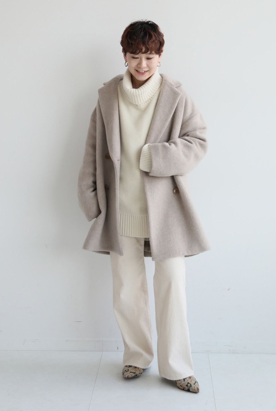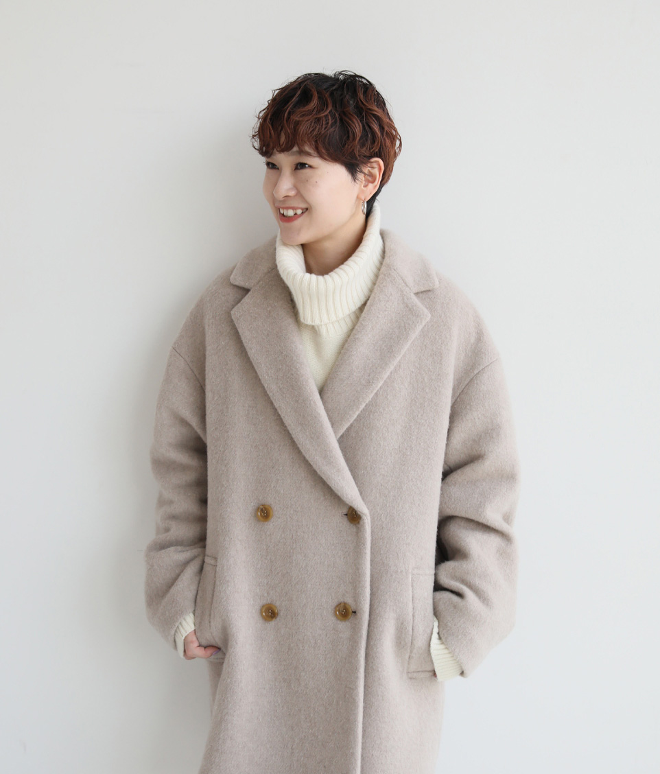 - ワードローブになじみの良いシンプルなショートコートはヘビロテ確実。ニュアンスカラーが洗練の印象にまとめてくれます。厚手のニットをインしてもすっきりまとまるフィットも嬉しい。
