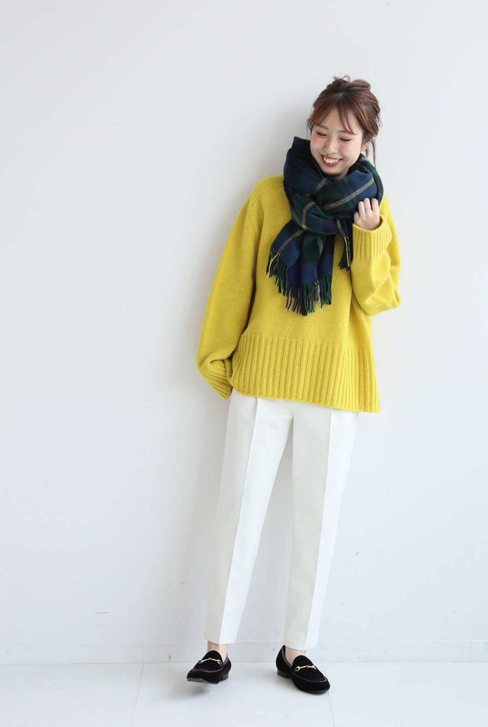 - まだ日中はニットだけでOKな陽気の日なら、1枚で着映えるイエローをチョイス。トレンドのまろやかトーンがぐっと洒落感を高めます。朝晩は、チェックの大判マフラーを巻いて見た目にも暖かく。