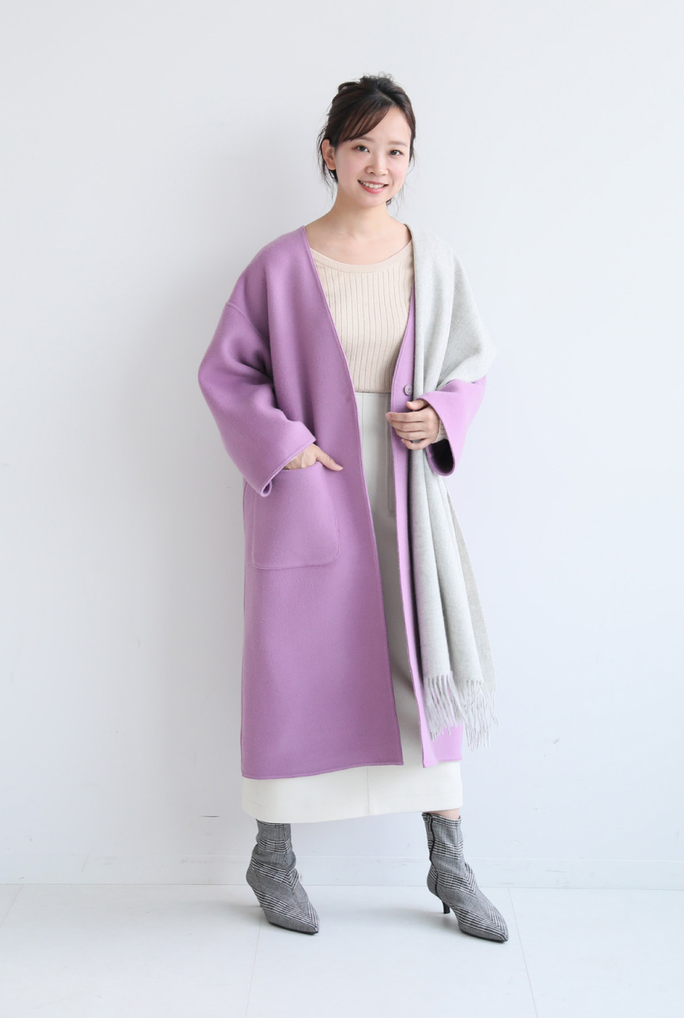 - 冬はコーデの「顔」になるアウターだから、着映えるキレイ色のフェミニンコートをストックしておきたい。今季らしい色のライラックは、トレンドのベージュとなじみよく、大人っぽい雰囲気で◎。落ち感のあるシルエットにも注目です。