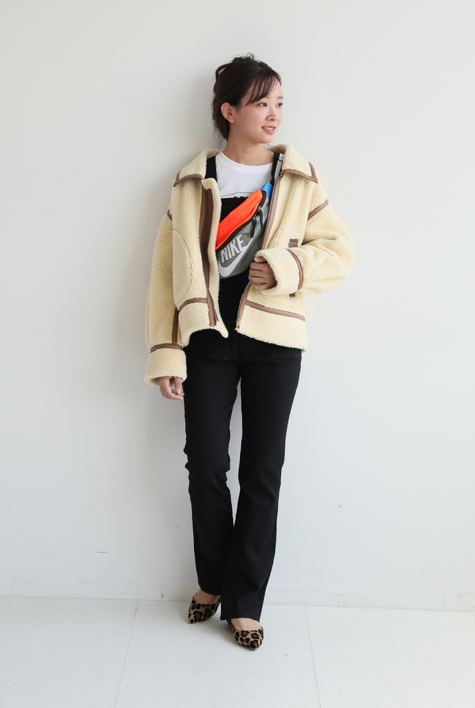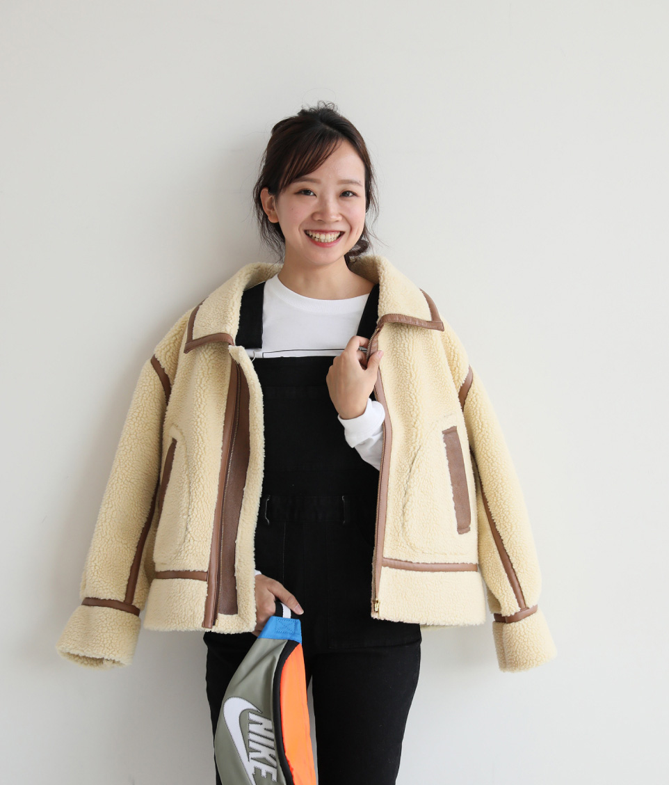 - メンズライクなボアブルゾンはコーデの外しにぴったり。スポーティなボディバッグもアクセントに。タイトフィットのオールインワンと黒パンプスを合わせて、女らしさをキープするのが甘辛バランスの良い塩梅。