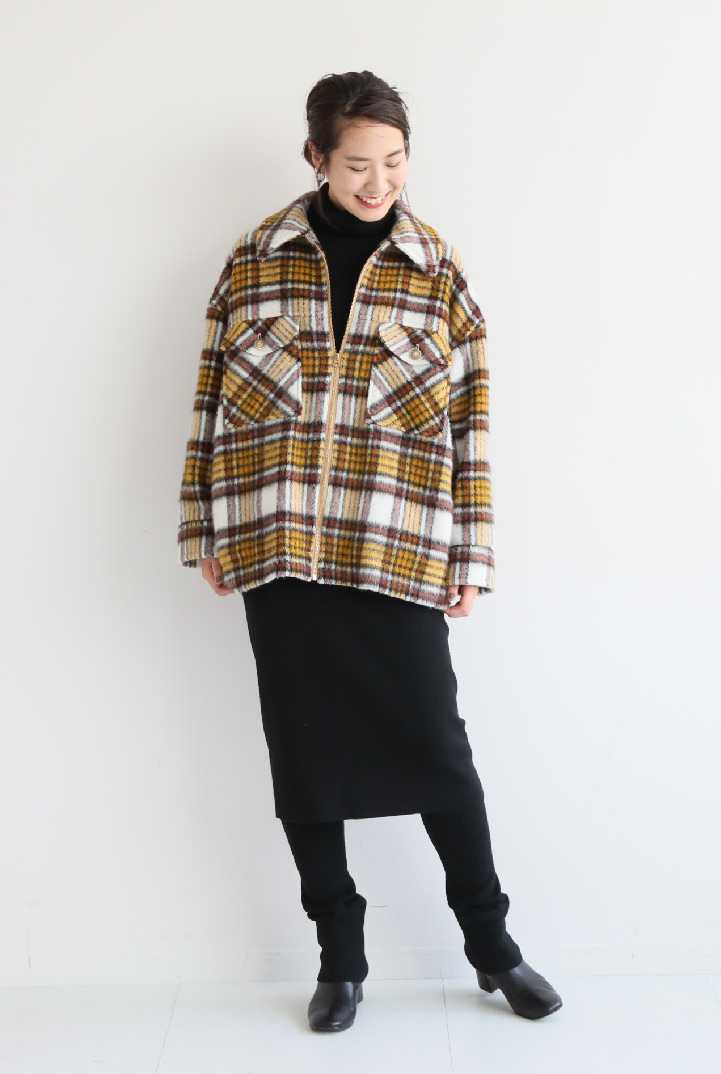 - オーバーサイズのゆったり感と黄色チェックのカラーを生かすために、あえて中はスッキリとブラックでまとめています。冬は厚手のニットを着込めば、アウターとしても活躍しそう。