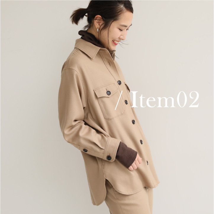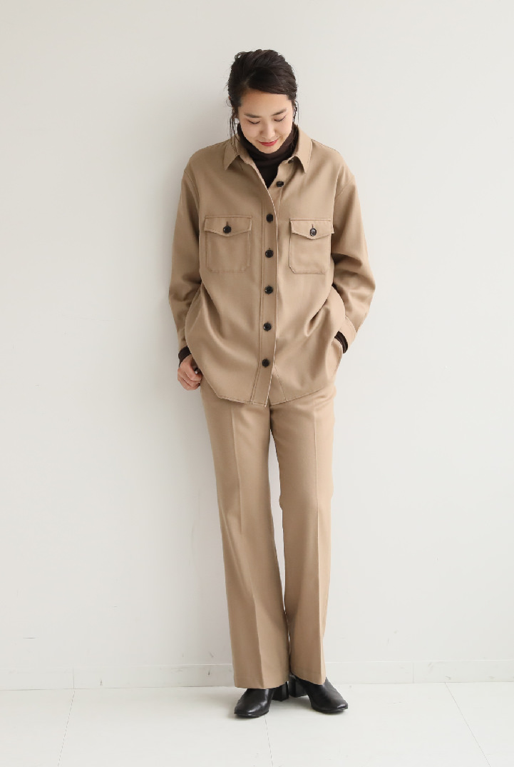 - こちらはキレイめにまとまる、クリーンなムードのCPOシャツ。ほどよくゆとりのあるシルエットだから、シャツとしてもライトアウターとしても幅広く活躍。同素材のフレアパンツを合わせたセットアップの着こなしも、トレンドど真ん中。