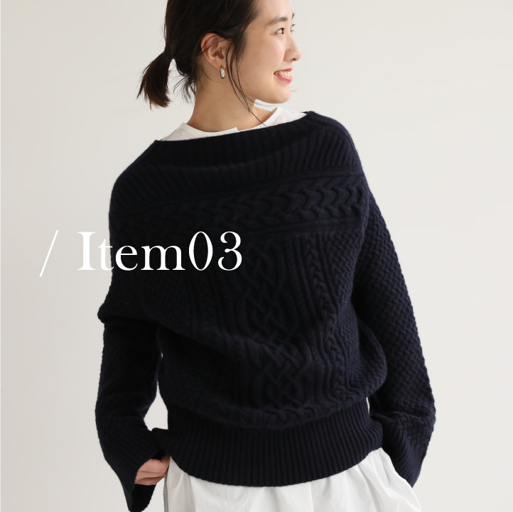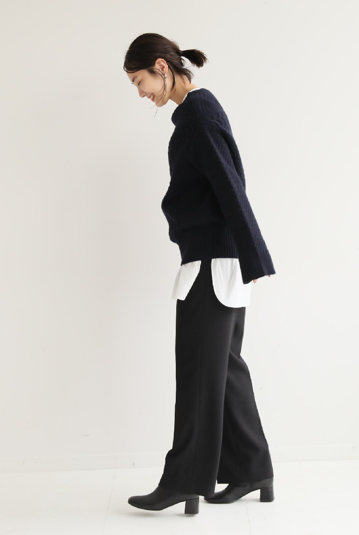 - 肌寒くなると着たくなる、アラン編みニットをパッチワーク調にアレンジしてさらに表情豊かに。レイヤードもしやすいボトルネックとドロップショルダーのデザインが、女性らしい抜け感を演出します。