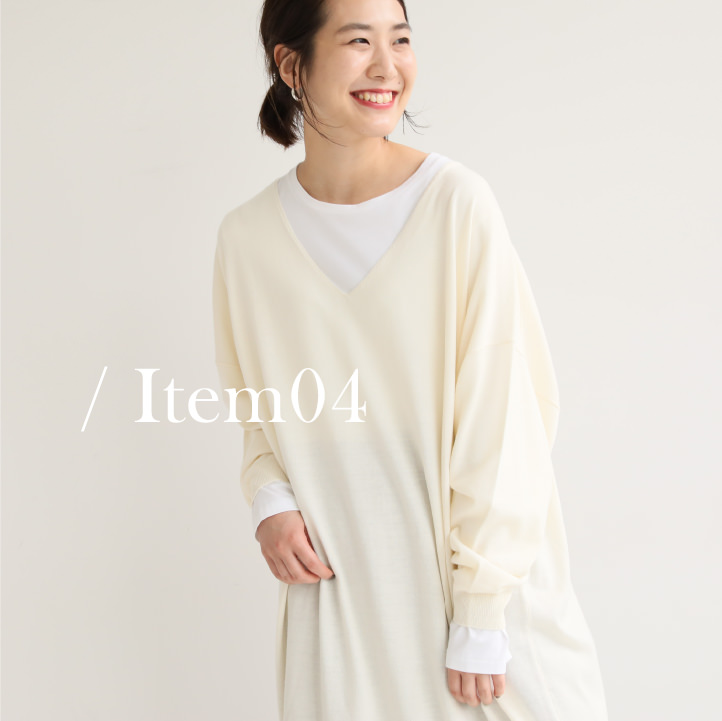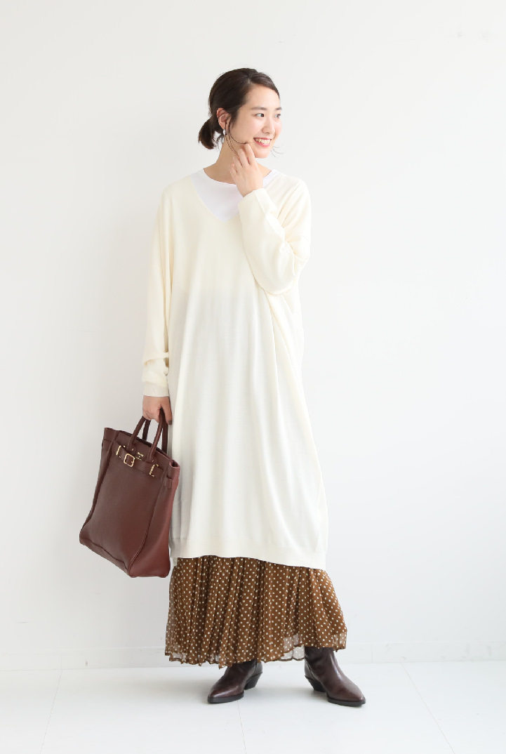 - シンプルで着回し力抜群の、Vネックのロングニットワンピース。デコルテ周りをキレイにみせるVカットと、ドロップショルダーの抜け感が女性らしいムード。膝が隠れるロング丈にさらにマキシスカートを合わせた、重ためのレイヤードで着こなすのがオススメ。