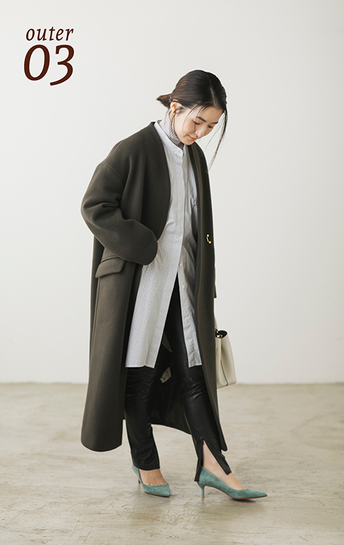 「ノーカラーコートは襟元のラインがシャープな表情を作るので、ハンサムな雰囲気でコーディネートできる一枚。肩を落としたボリュームシルエットが、今年らしい着こなしに更新してくれます。コートの色がカーキブラウンなので、インナーは明るい色をチョイスして軽さをプラス。薄手のハイゲージニットにロングシャツのレイヤードが、マンネリになりがちな冬のスタイルに変化をつけてくれます。コートにボリュームがある分、レザーパンツはスリットで肌見せして抜け感を演出。バッグや靴も明るいカラーを足すのがポイントです」