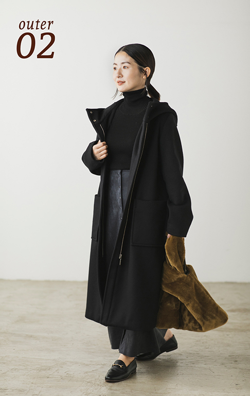 「カジュアルに見えがちなフーディコートを大人っぽく着こなすには、コートと同じダークな色味で全身をつなぎ、シュッとしたIラインを作るのがおすすめです。トップスにはフードのボリューム感に負けないタートルネックを合わせると目線が上がり、すっきりとした印象に。ボトムはエコスエード素材の辛口ロングスカートをセレクト。前にボタンが並んでいるので縦のラインが強調され、バランスアップが叶います。ローファーを合わせた足元は、わずかに肌見せするだけで抜け感が生まれ、洗練度がアップ。全体のトーンがシックな分、ふわもこファーバッグで、遊び心ある大人の可愛さをプラスします」