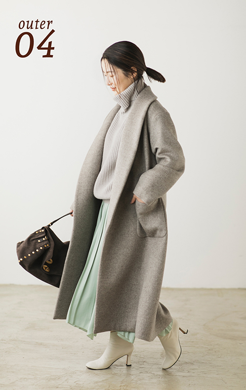 「ショールをまとっているかのようなリッチなムードのコートは、ゆったりと羽織る着流しタイプ。ライトグレーの色を生かし、全身を淡いトーンでまとめると女らしい印象に仕上がります。コートの生地に厚みがある分、アシンメトリーに揺れるプリーツスカートを合わせて動きを出し、軽やかさを演出。長めのコートの裾から、ミントグリーンのスカートの裾をちらりと覗かせるのがポイントです。足元はホワイトのショートブーツで、軽快かつ洗練された雰囲気にまとめて」