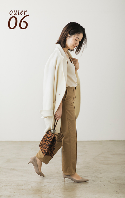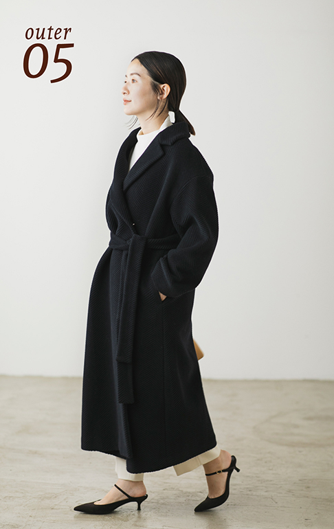 「厚手のニットにも羽織れるオーバーサイズのチェスターコート。共布ベルトでラフにウエストマークしたら、襟を抜いて羽織るのが重たい印象にならず、バランスアップして見えるコツです。コートの色味がダークなので、インナーには白のリブニットとウールの白パンツを合わせて、軽さを足して。白でつないでも異素材を組み合わせているので、コートを脱いでものっぺりした印象にはなりません。こちらのコートはベルトを外して着たり、前を開けてガウン風に着流したり、いろいろな着方が楽しめるデザインなので重宝しそうです」