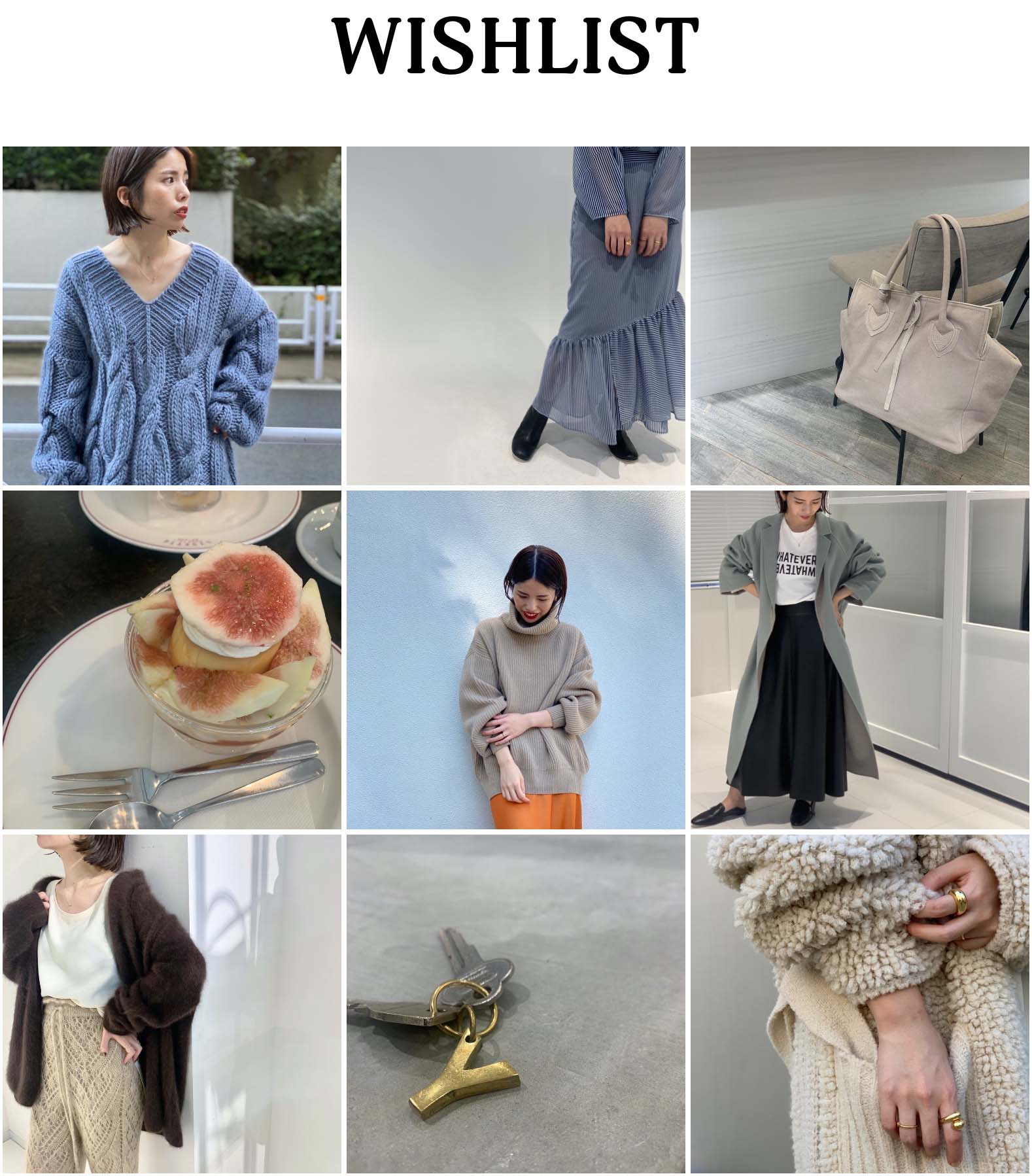 - (左上から横に)①ボリューム感がたまらないローゲージニットに一目惚れ♡②4thコレクションのN.jamはこのセットアップに決まり③ビックトートはくたっと感がお気に入り★④秋になると止まらないイチジク欲⑤カラースカートにボリュームタートルニットの合わせがお気に入り⑥クリーンなカラーコートはちょっぴりハードなアイテムと合わせたい気分⑦今年のラクーンニットはとにかく全色色が可愛すぎて。。。⑧お気に入りのキーリング⑨ボリュームリングはざっくりニットにも負けないインパクトがチャームポイント♡