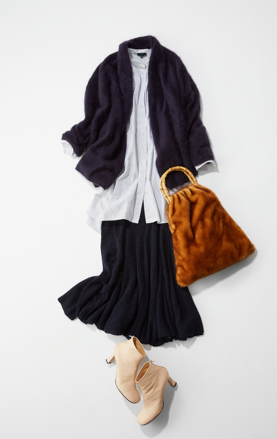 - 入荷する度に完売に続く完売で幻のニットと言われているファーニットカーディガン。 そんなカーディガンがOtonaMUSEの熱いリクエストにより再販決定!人気の理由はファーのようにフワフワとした質感と保温性も高くストレスフリーな着心地。ガウンのようにさっと羽織れるのもいいですね。ベルトをするとまた違ったスタイリングが楽しめます。 そんなカーディガンに合わせたのはPRESS展示会でも大人気だったイタリアのブランド“jejia”のスタンドカラーシャツに“JENE SMITH”のマーメイドニットスカート。ハンサムなシャツをあわせて甘すぎない大人のフェミニンスタイルの完成。