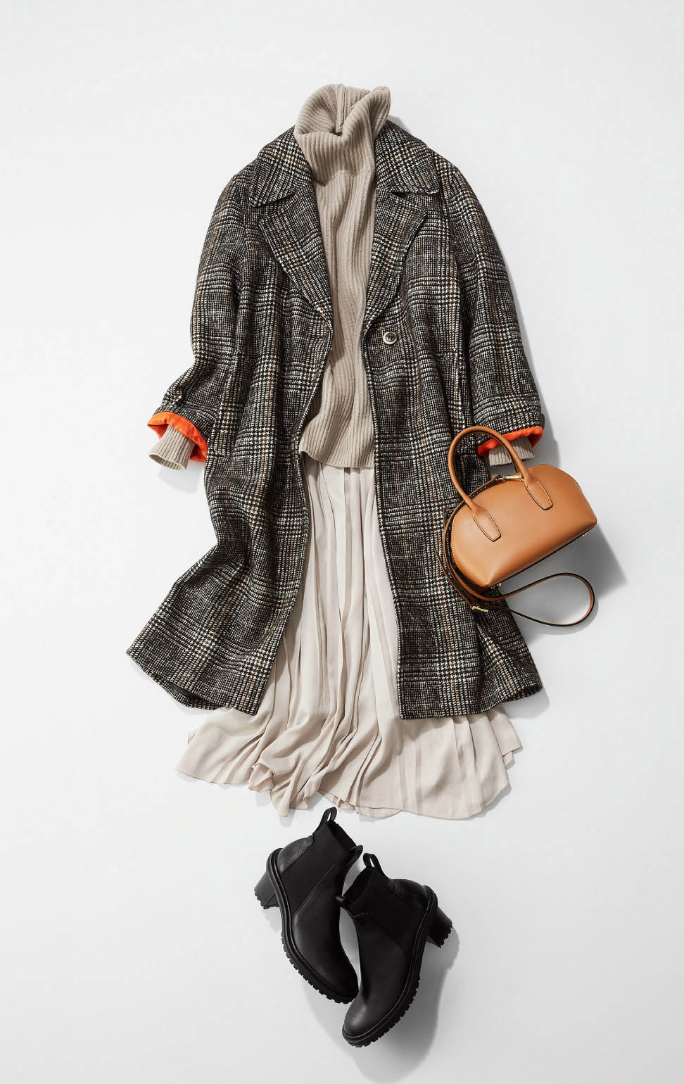 - アウターを専門とするフランスで生まれたブランド“MAISON LENER”。素材の良さ、 仕立ての良さで定評のある老舗ブランドです。NOBLEは裏地にもこだわりを持たせたスペシャルな別注を。袖口を裏返すと鮮やからオレンジカラー。メンズライクな千鳥格子のテーラーカラーコートも一気に華やかモードに。スタイリングに合わせたスカートは反して柔らか素材のプリーツスカート。太畦のニットはタートル部分を内側に折り返すのが着こなしのポイントです。足元には合わせるアイテムを選ばないPIPPICHICの万能サイドゴアブーツをでメリハリをつけて。