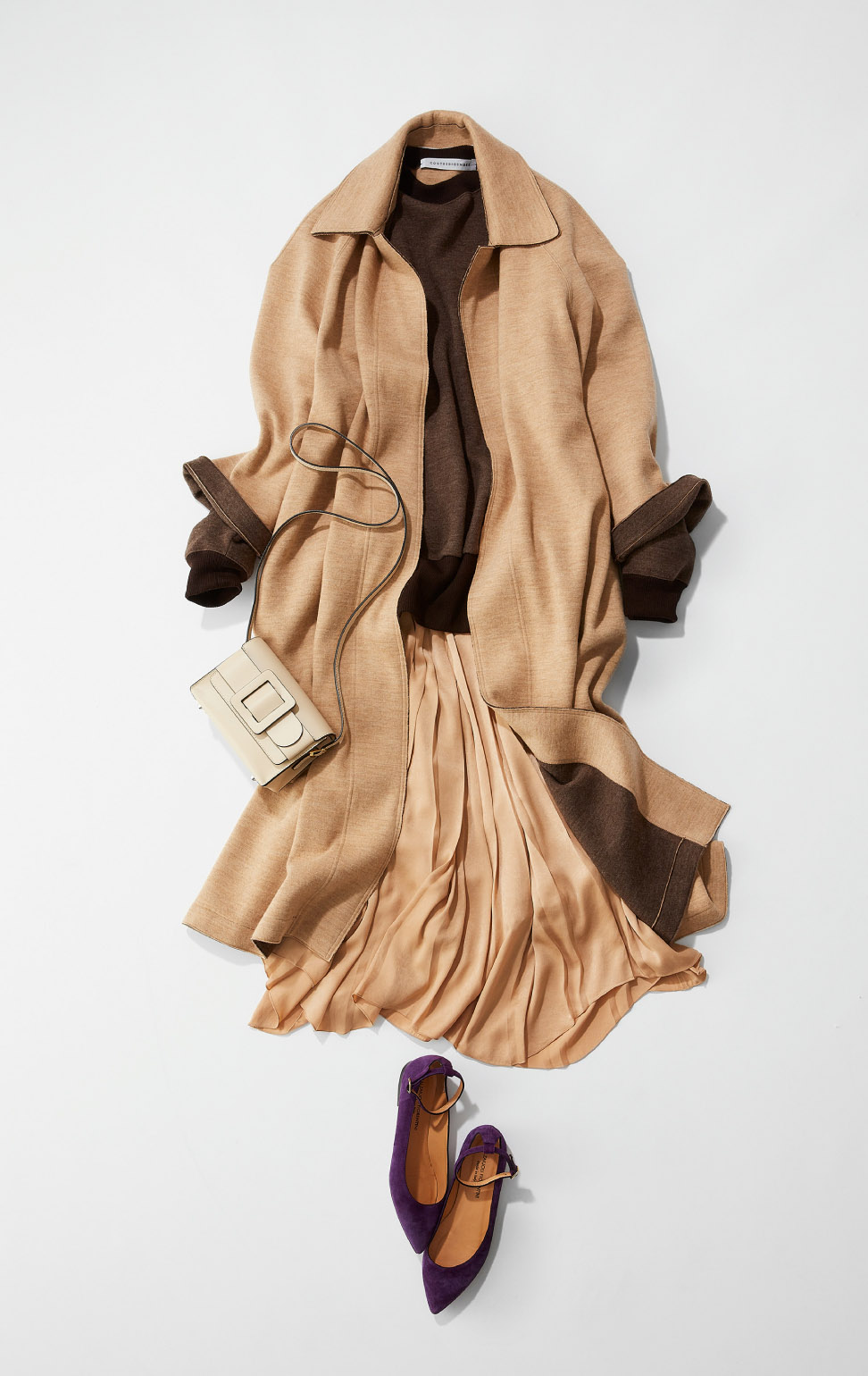 - 定番のシャツワンピースはいつもより冒険して旬なトレンドカラーを選んでみては。薄いラベンダーカラーは柔らかな印象で顔周りも華やかに映し出してくれます。ウエストがゴムの着易さと、洗濯可能でシワになりにくいのも嬉しい特徴。今回はテーラードジャケットを合わせてみましたが、インナーにタートルネックを合わせても素敵ですね。優等生な着こなしもパイソン柄ストラップのバッグでポイントを。