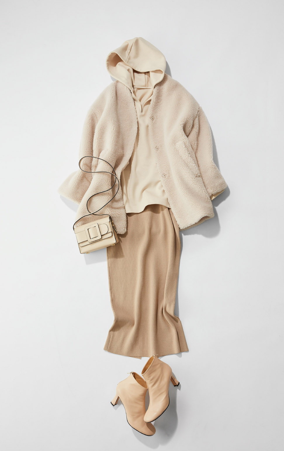- カジュアルアイテムのスエットパーカーも、NOBLEらしさが加わると女っぽさを感じられるはず。Vネックの素肌が見える首元や、身体が泳ぐボリュームのあるシルエット、クシュッとなる長めの袖もカジュアルアイテムながらもどこかフェミニンなムード。 合わせるのはこの冬の人気アイテムでもあるボアジャケットと、女っぽいシルエットのボディコンシャスなリブタイトスカート。同色のアイボリーカラーで全体のトーンを合わせて柔らかなカジュアルフェミニンスタイルに。冬のアイボリースタイルはいつの時代も人気です。