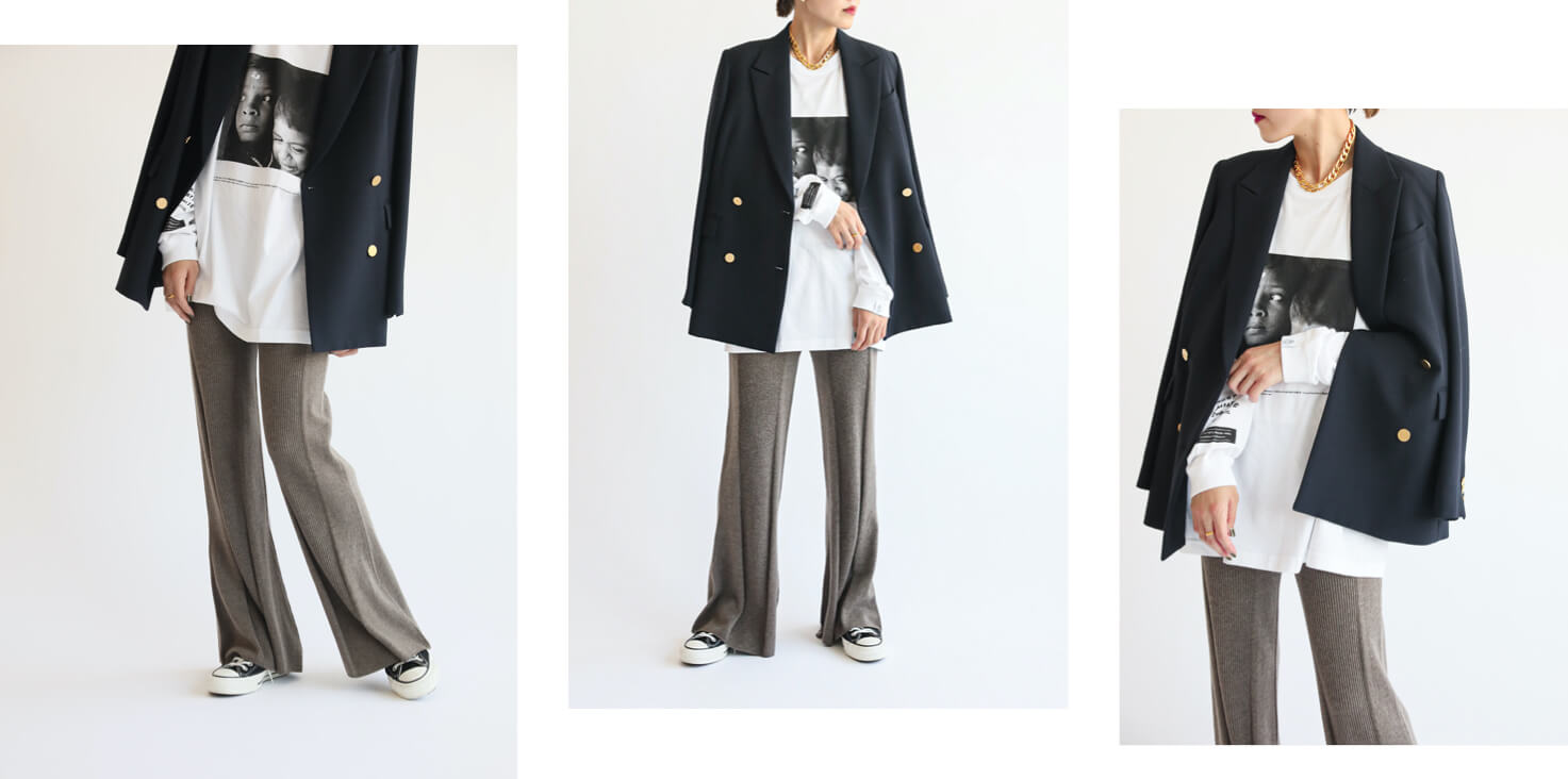 ニットパンツとスニーカーでジャケットスタイルを程よくカジュアルダウン。 - JOURNAL STANDARD L'ESSAGEウールトリコチンジャケット◆¥39,600(税込)