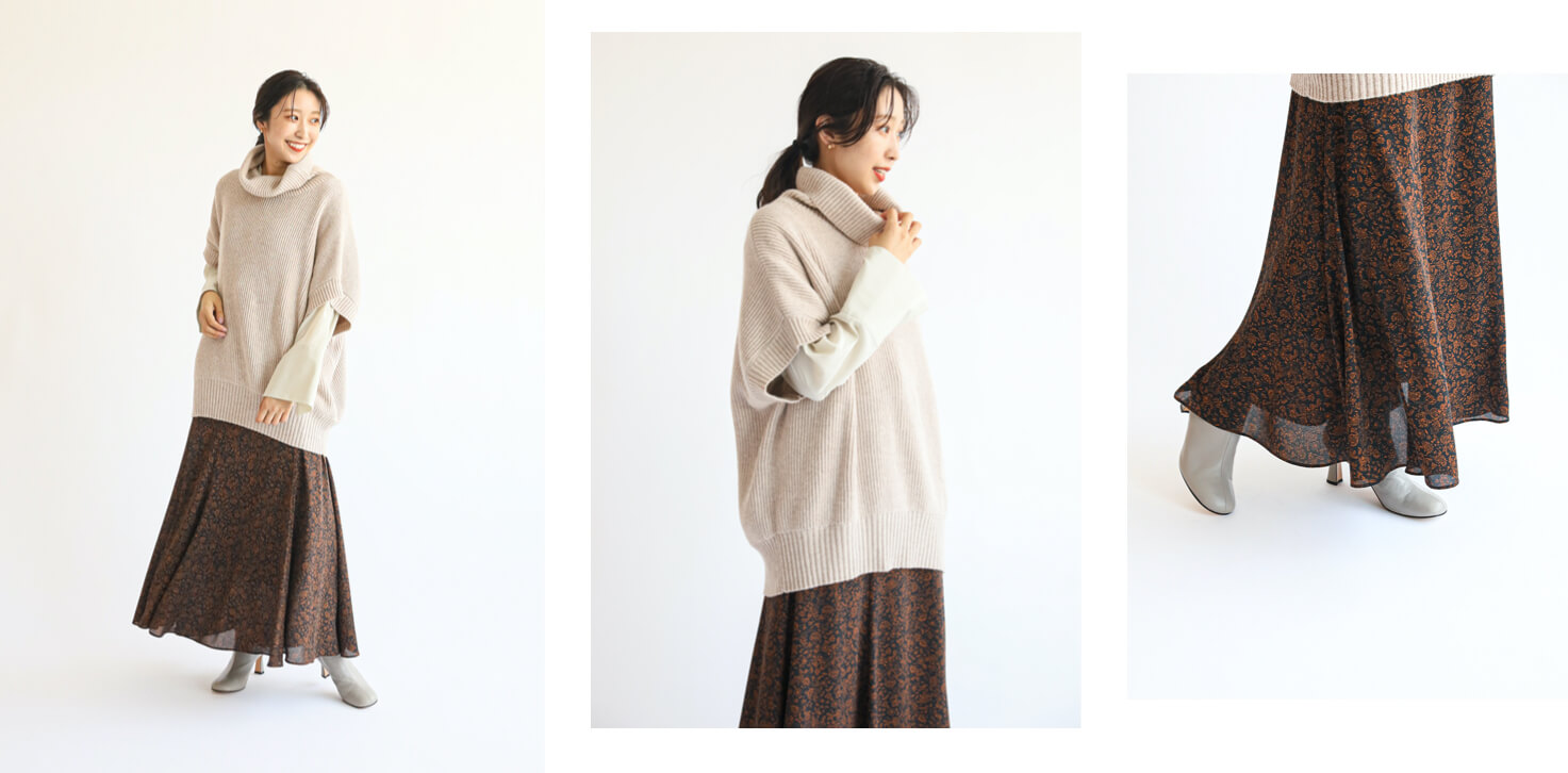 - ボトムスには、ふんわりとしたシルエットの"Uhr"のスカートをチョイス。