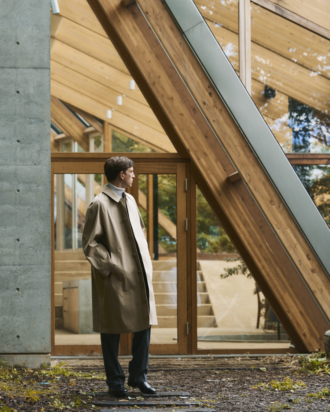今ではすっかり当たり前になったコットンシェルのゴアテックスは、実はナナミカが最初に認可を受けた技術。その象徴たるロングセラーのコートを、とあるフランス製の古着にならった大きめのシルエットにアレンジ。襟は小さめ、袖は太めの1枚仕立てで、バサッと着るくらいがこなれて見える。後ろの首元にはゴアテックスのネーム入りで、襟を立てると覗く仕組み。