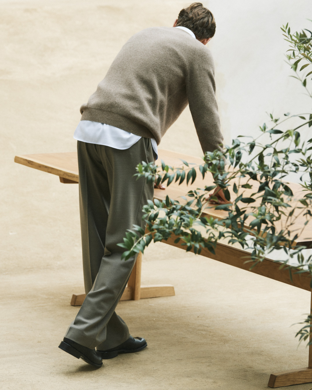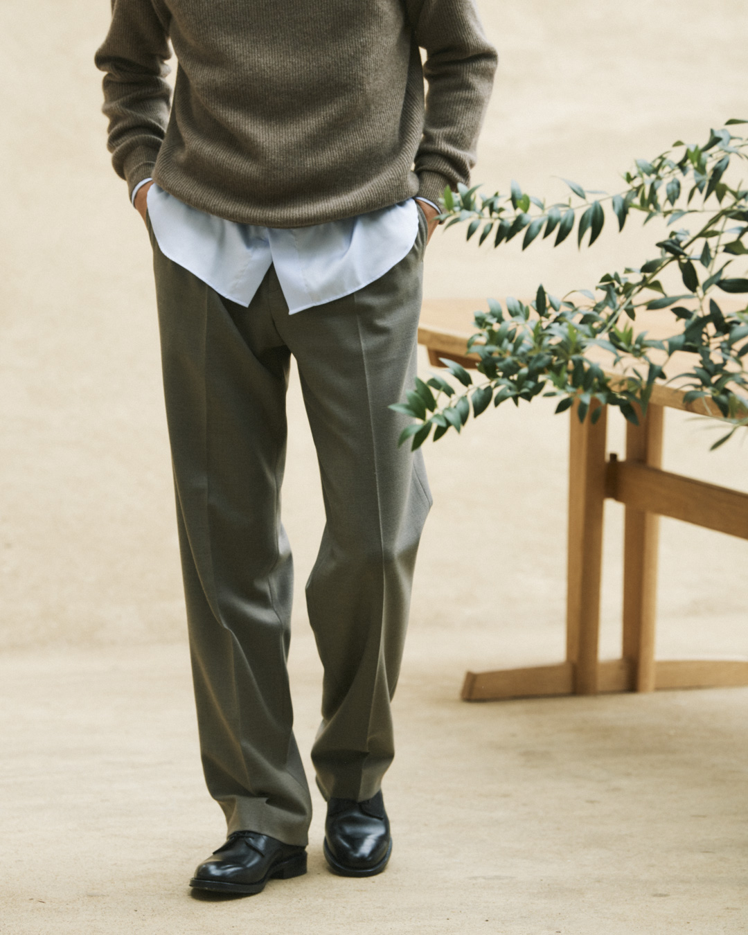 ゆったりとしていて裾までストンと落ちる、潔いストレートのパンツが今また新鮮だ。フランスの老舗にエディフィスがリクエストしたのは腰とヒップのゆとりを増した特製シルエットのモデルで、その名も"ラスパイユ"。上質なウール地で品良くクリーンながらアメリカのワークパンツのように気負いなく穿ける。いつも通りのレザーシューズやスニーカーに合わせて。