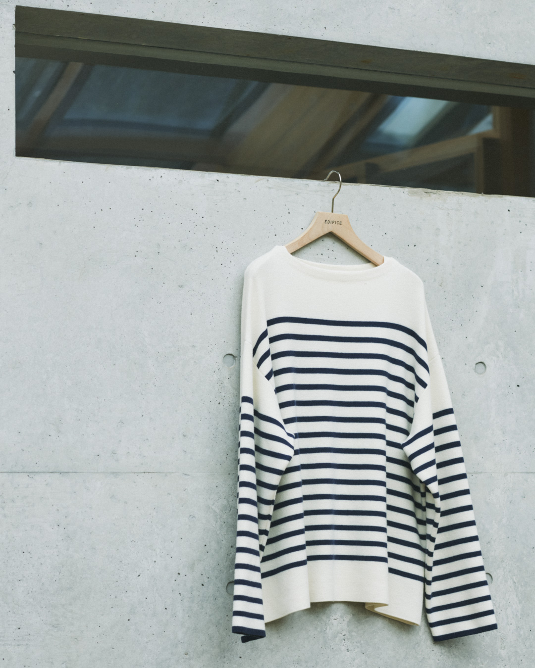ピカソやシャルロット・ゲンズブールも着ていたマリンボーダーのバスクシャツ。そんな定番のスタイルを、カシミヤのようにきめ細かいウールニットで再現したのがこれ。国内有数のニット工場、ウメダニットで生産されていて、ほどよい肉厚さと大きめのサイジングはデイリーユースにぴったり。ボートネックの形は少しだけ幅を狭めにすることで着やすいバランスに。