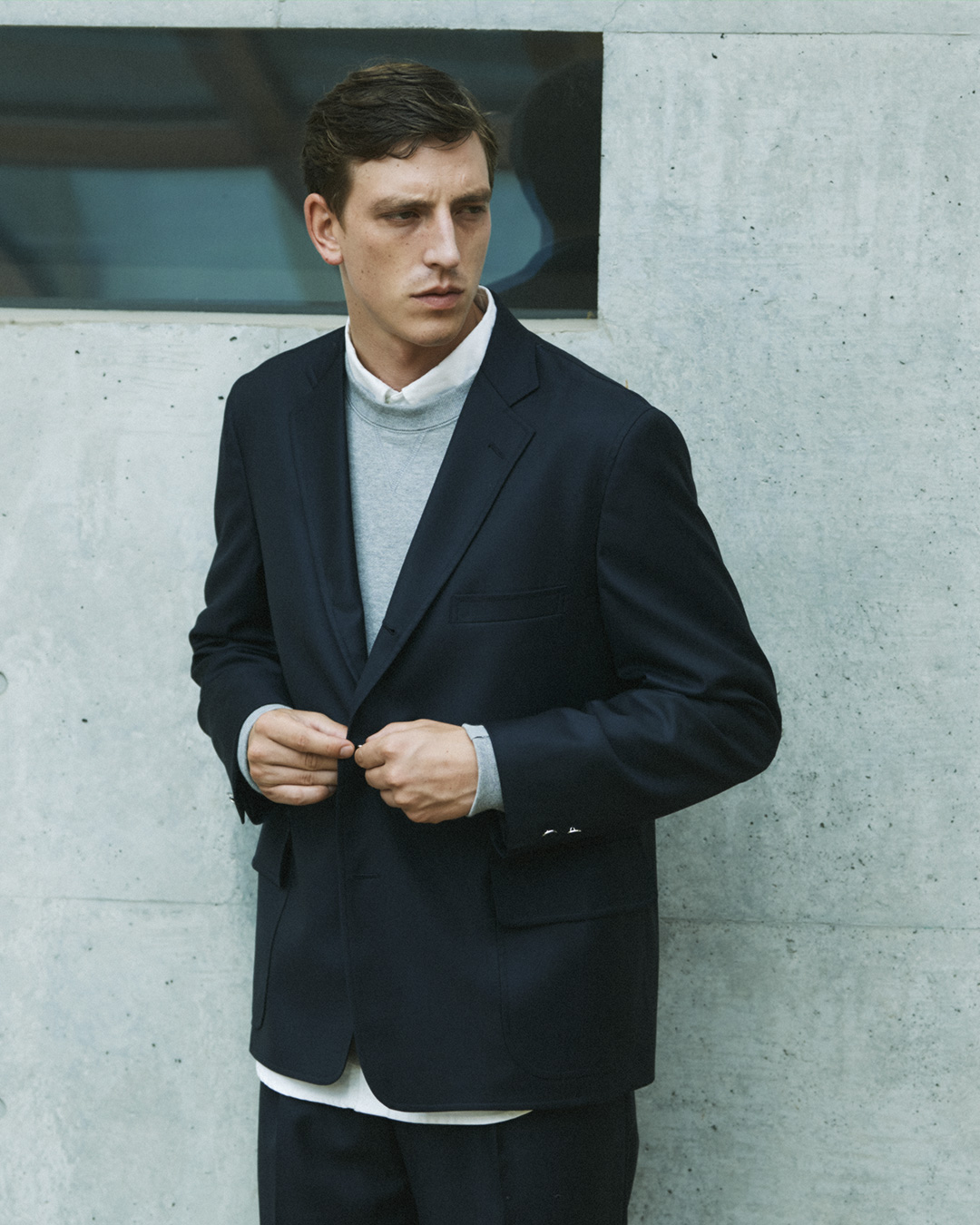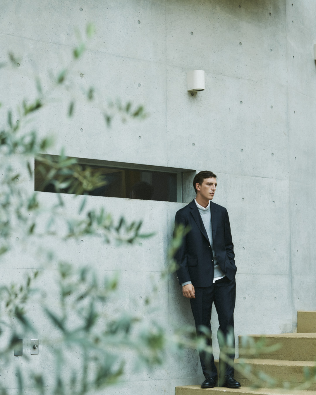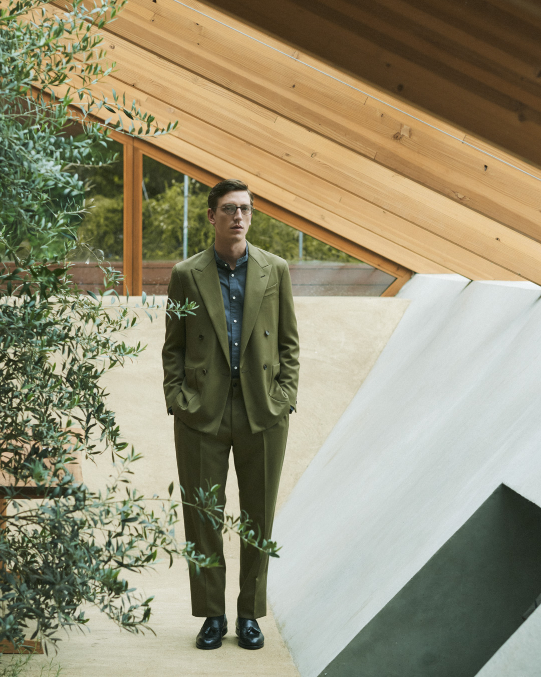 セットアップダブルのジャケット。だけど、デ・ニーロみたいなグラマーなやつじゃなく、普段着にちょうどいい軽やかさ。クラシコ好きのイットブランドにあえてコンテンポラリーな1着をオーダーしたもので、羽織るだけでもサマになる。別売りのパンツは2種類の形が揃い、ここで合わせたのは太めのタイプ。それぞれ単体でも活躍しそうだけど、やっぱり上下セットで着たくなる。