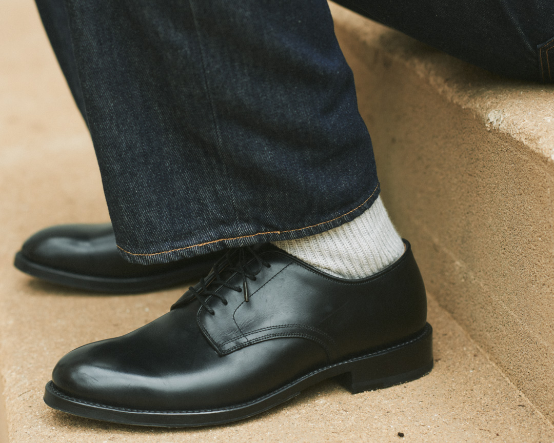 プレーントウシューズ米国の名門シューメイカーの輸入元という来歴を持ったこのブランドは、自社での製靴もそれに劣らないクオリティ。サービスシューズを思わせる外羽根のこの型には米国・ホーウィン社のレザーを使うのが通例。それをエディフィスではドイツのワインハイマー社のボックスカーフに変更し、トウが細身のラストを指定したことで、見違えるほどエレガントな表情に。