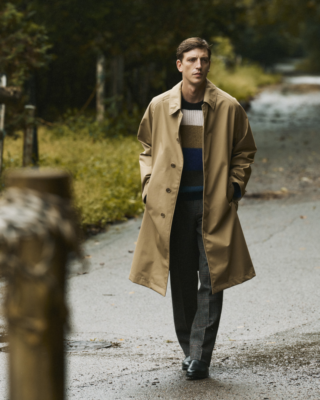 ステンカラーコートマッキントッシュがかつて生産を手がけた、某フレンチメゾンの乗馬用コートに着想を得てつくられた1着。人気モデル"デュナンス"のディテールをアレンジし、英国トラッド然としたタッターソールの裏地を配した特別仕様だ。着ているときにはスタンダードなゴム引きコートに見えて、英仏両方の品格を確かにはらんでいる。こだわりの2枚袖がさりげないアクセント。
