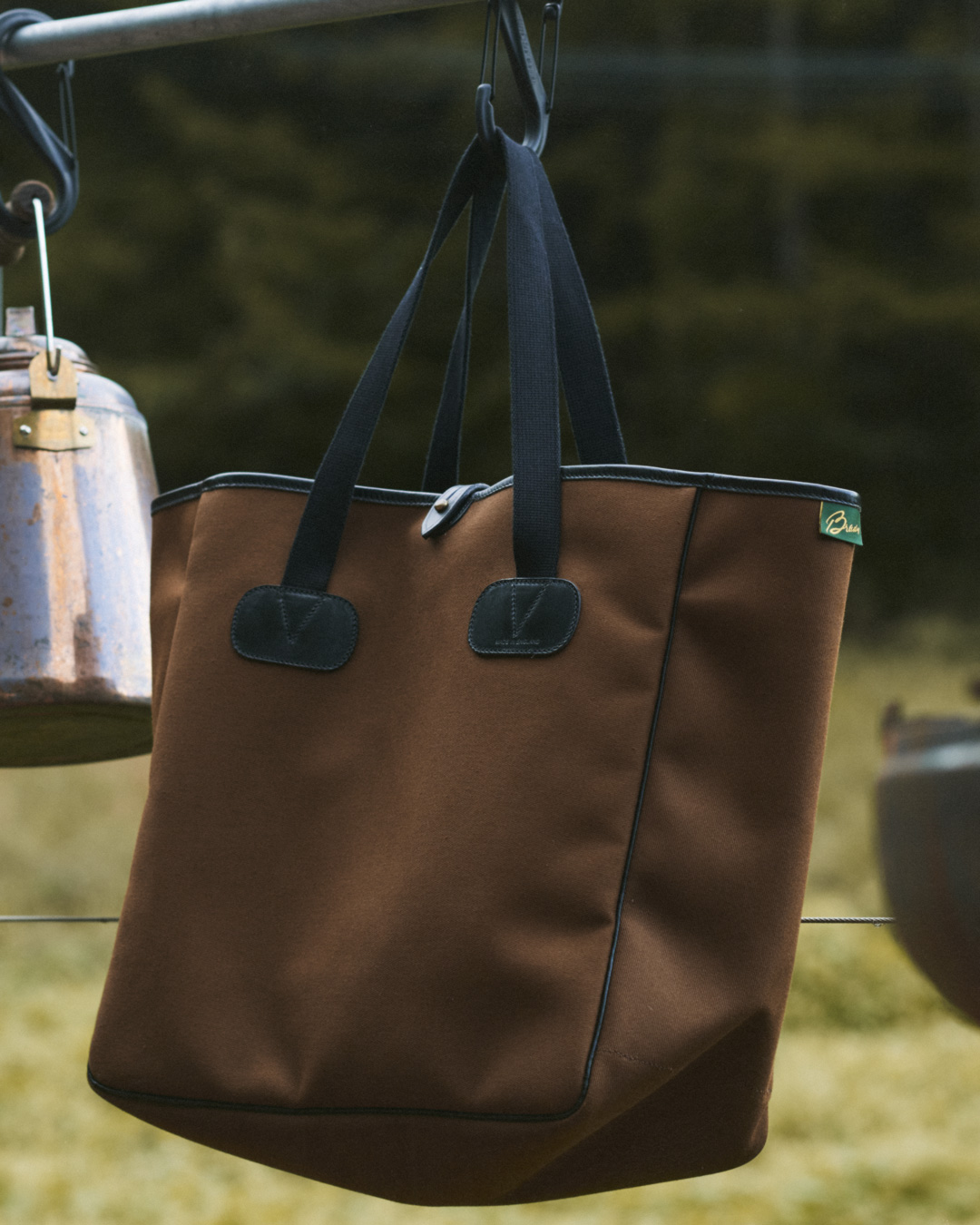 とにかく分厚いコットンに、頑丈なブライドルレザー。これぞ英国クラシックと言わんばかりのトートをヘーゼルナッツみたいなブラウンにしてみたら、グッとモダンに見えてきた。そもそも余計な装飾がないものだから、手を加えるのは色だけで。女子と兼用できそうなものから小旅行に使えそうなものまで3つの大きさがあって、これはちょうど真ん中のサイズ。